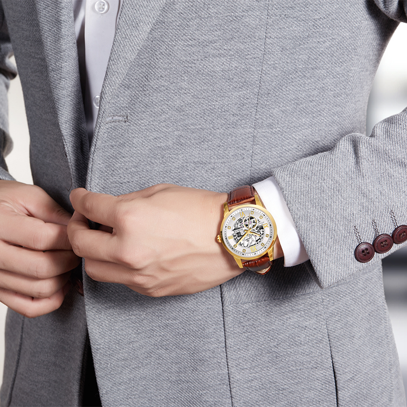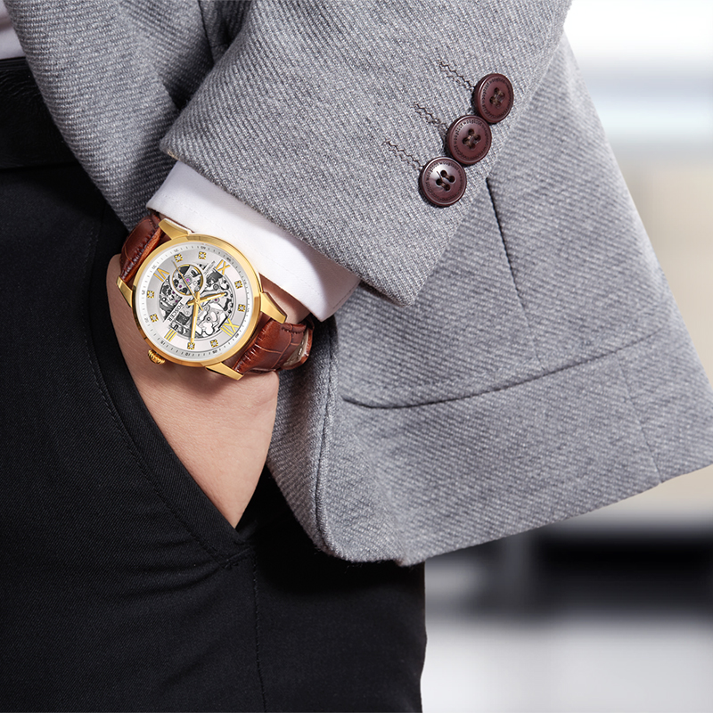 宝时捷正品 手表皮表带情侣手表送男友50032 手表男镂空机械表男士