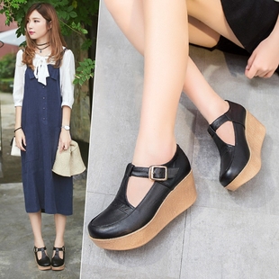 女鞋 女厚底高跟扣带休闲软底皮鞋 复古文艺真皮单鞋 2025春夏秋新款