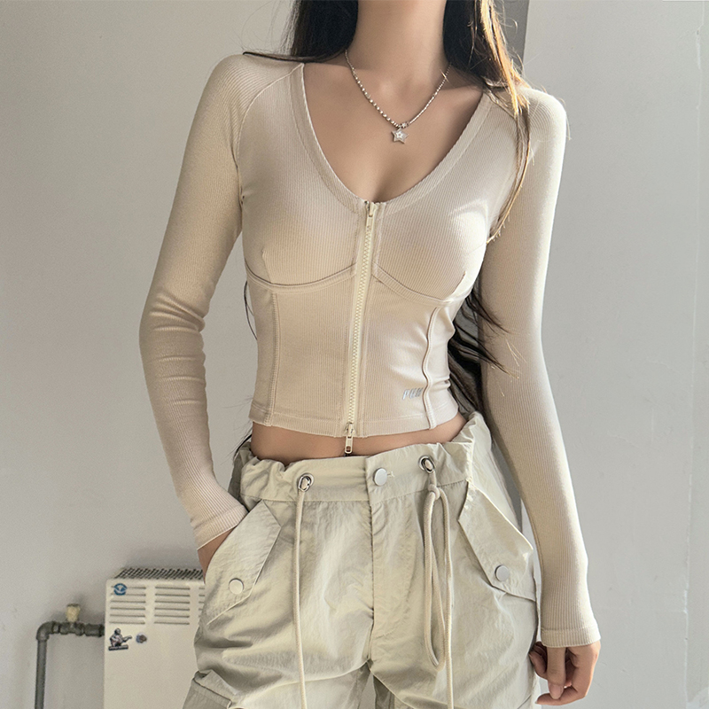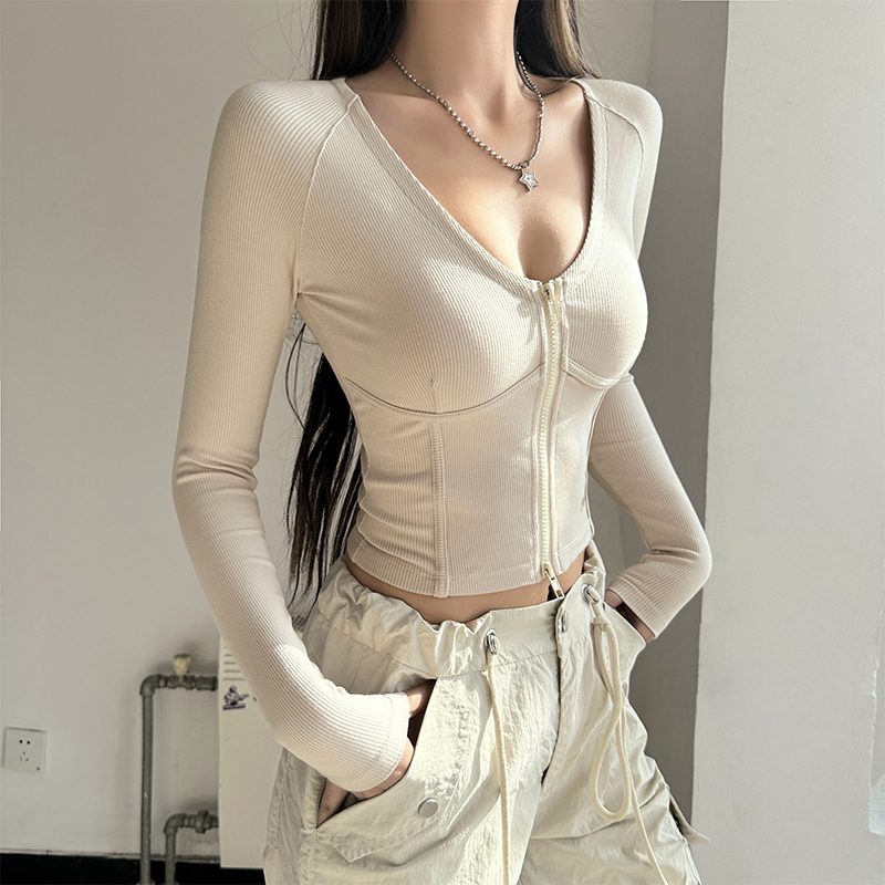 复古双拉链V领打底衫 短款 长袖 修身 拉链上衣 女2025新款 TEETKE美式