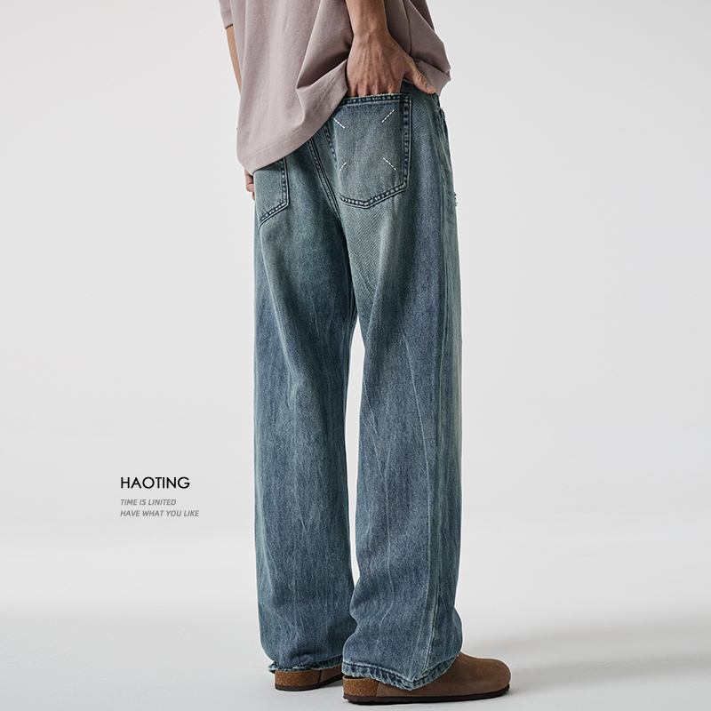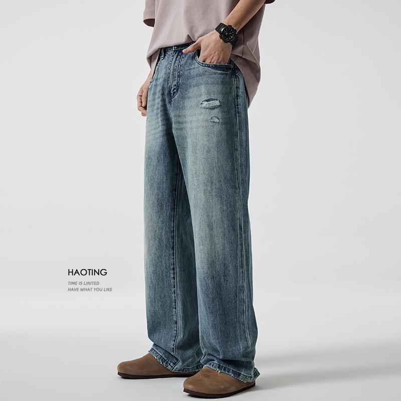 cleanfit浅色休闲直筒阔腿裤 春季 男士 豪霆.宽松微喇叭破洞牛仔裤
