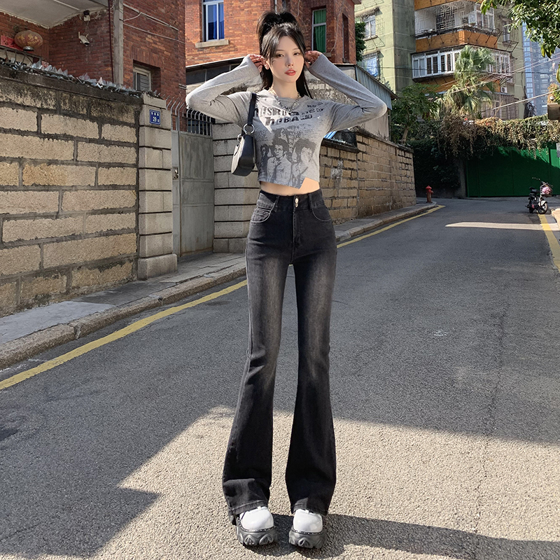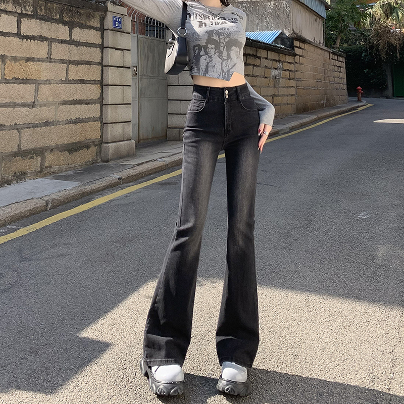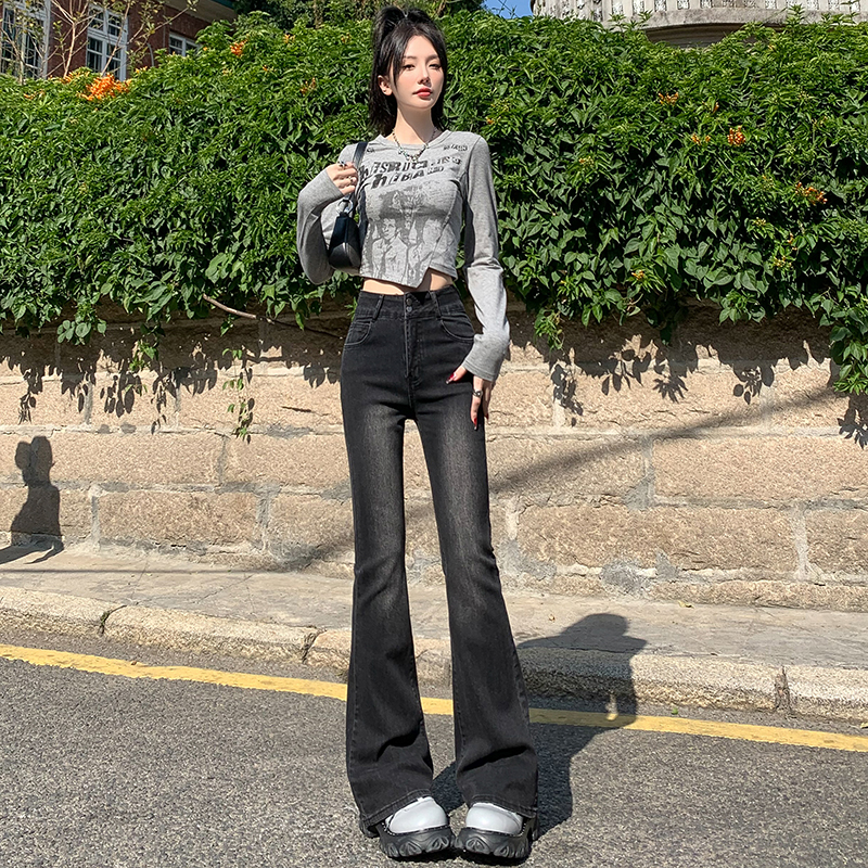弹力马蹄裤 黑灰色高腰微喇叭牛仔裤 显瘦辣妹修身 新款 子 女2025春季