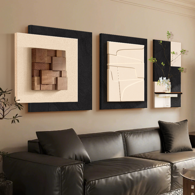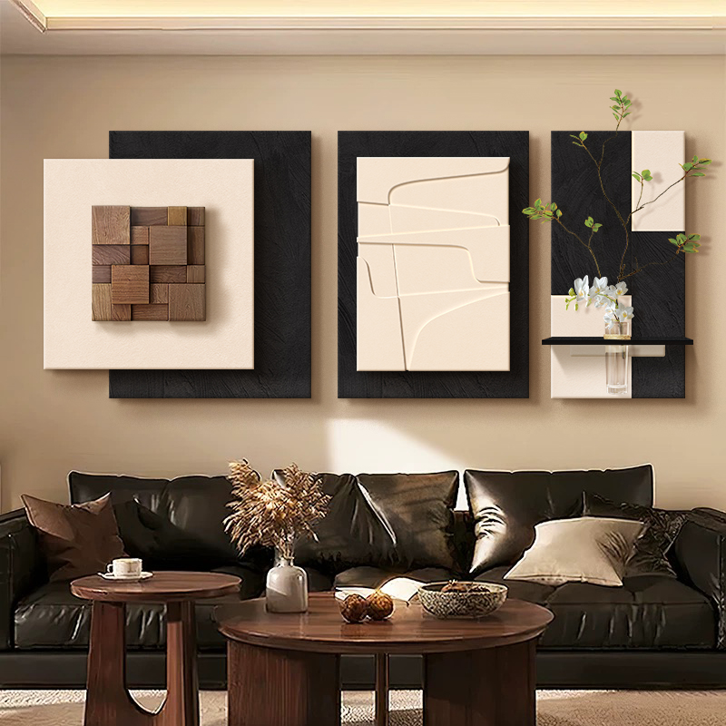 现代轻奢客厅装 饰画三层立体高档胡桃木绿植黑白沙发背景墙壁挂画