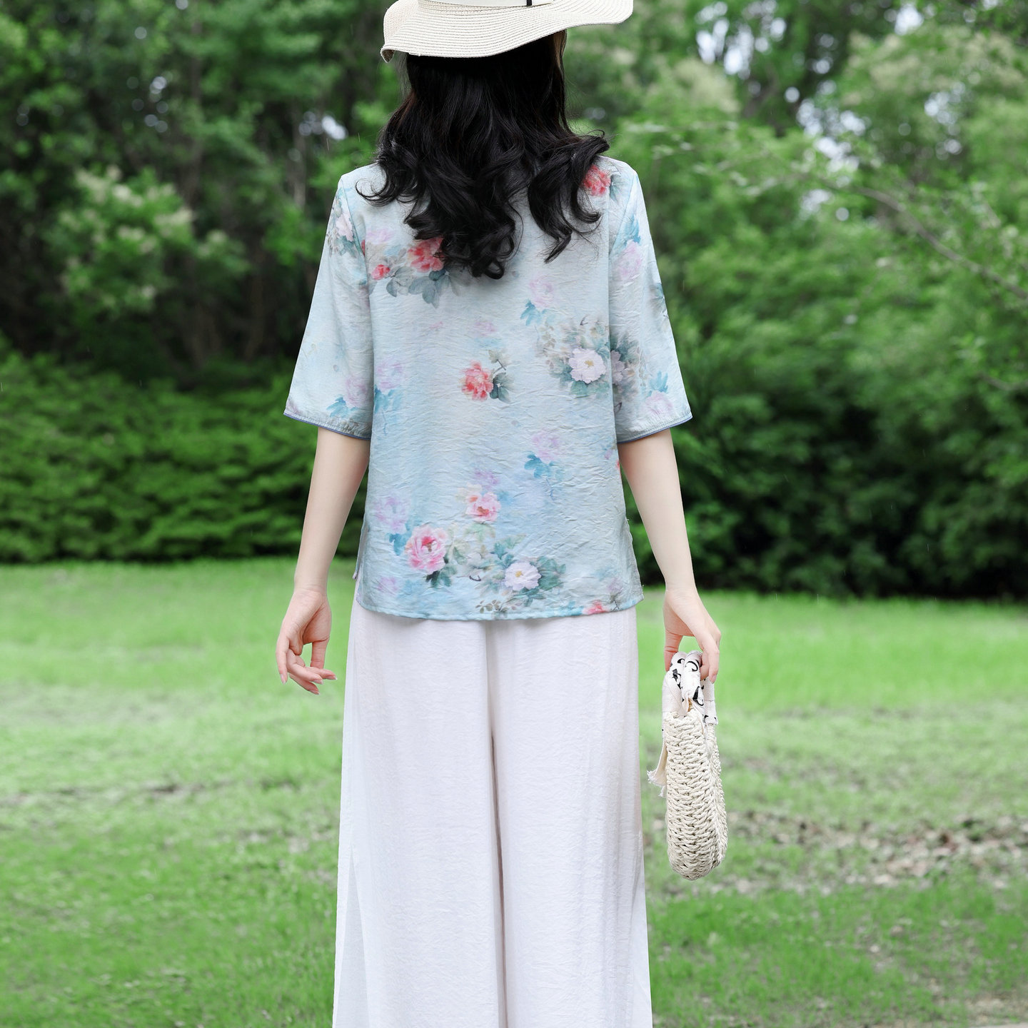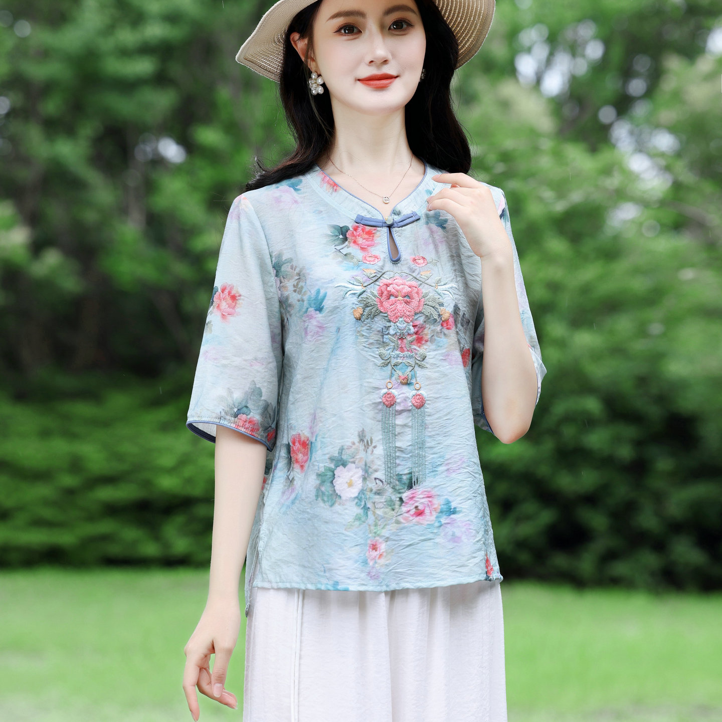 复古盘扣圆领小衫 新中式 新款 女2025夏季 棉麻上衣 国风刺绣苎麻衬衫