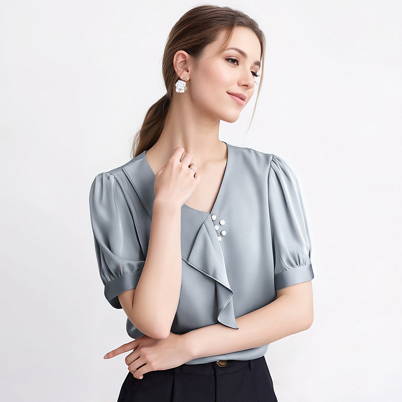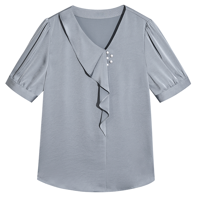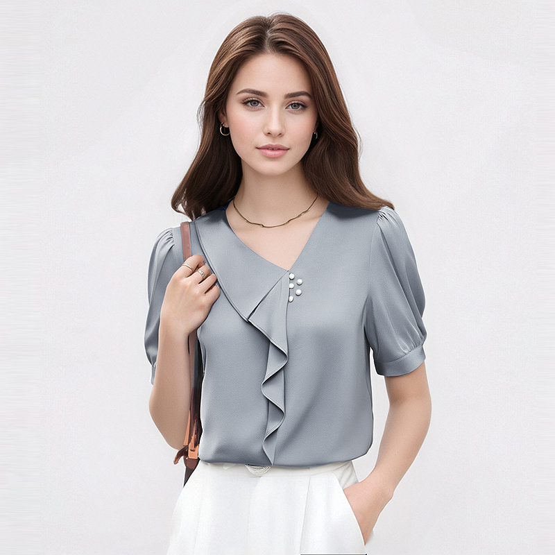 2025夏款 女职业装 不对称荷叶边轻奢高级感衬衣 雪纺衬衫 浅灰色短袖