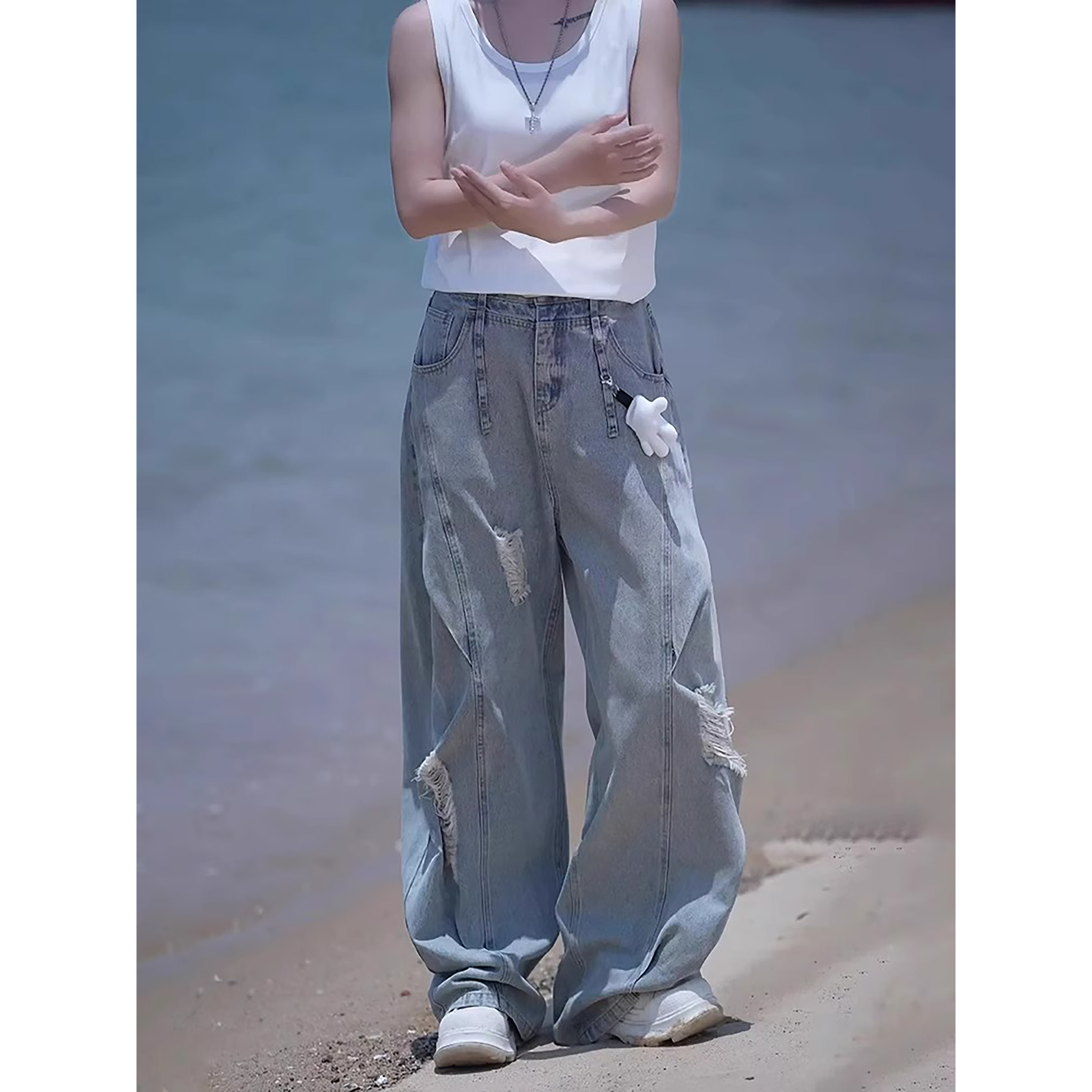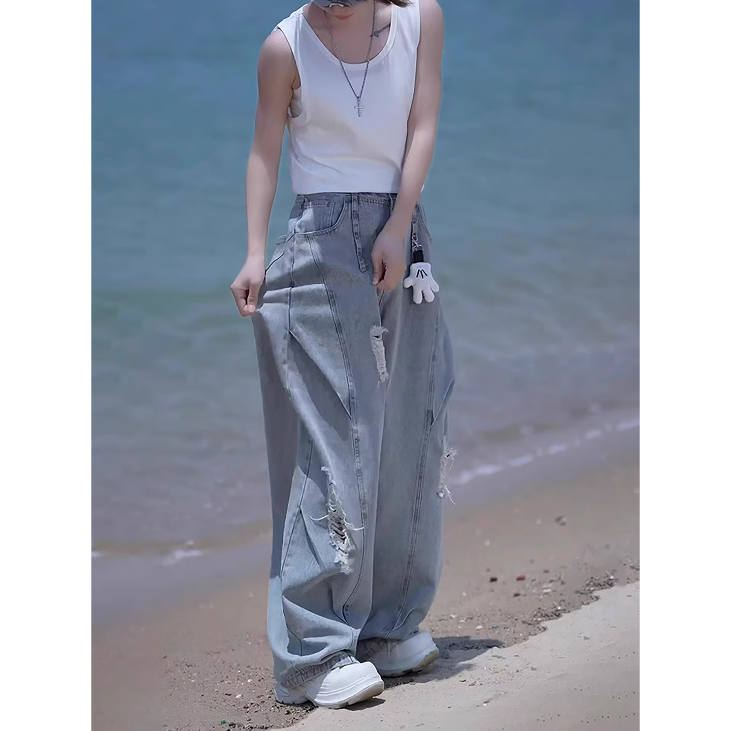 子 高腰显瘦垂感拖地直筒裤 淘稚气丹宁蓝宽松阔腿牛仔裤 女2025秋季