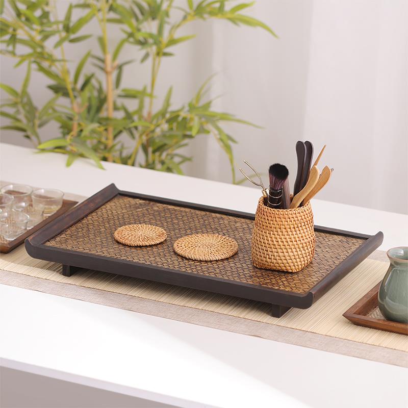 实木竹编藤编户外茶托盘 干泡台茶盘家用日式 泰式 复古茶具托盘中式