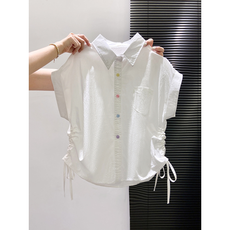设计感短款 彩色扣子抽绳正肩短袖 新款 女2025夏季 宽松百搭上衣 衬衫