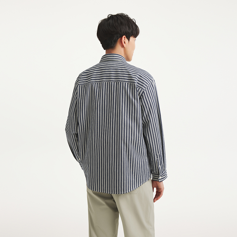 马登工装 男日系vintage垂感衬衣 复古港风早秋磨毛蓝色条纹衬衫