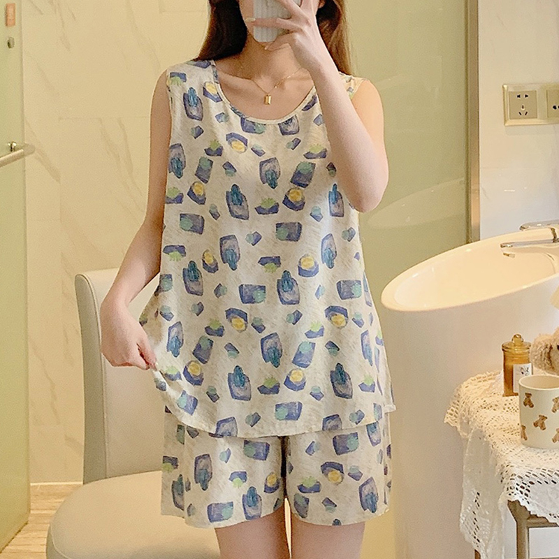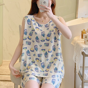 背心短裤 大码 睡衣女士无袖 韩版 宽松绵绸家居服人造棉 棉绸薄款 夏季