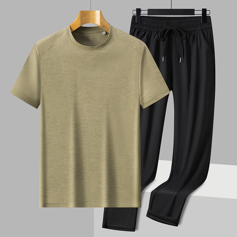 圆领T恤衫 中老年男冰丝短袖 套装 夏季 父亲上衣薄款 爸爸装 长裤 新款