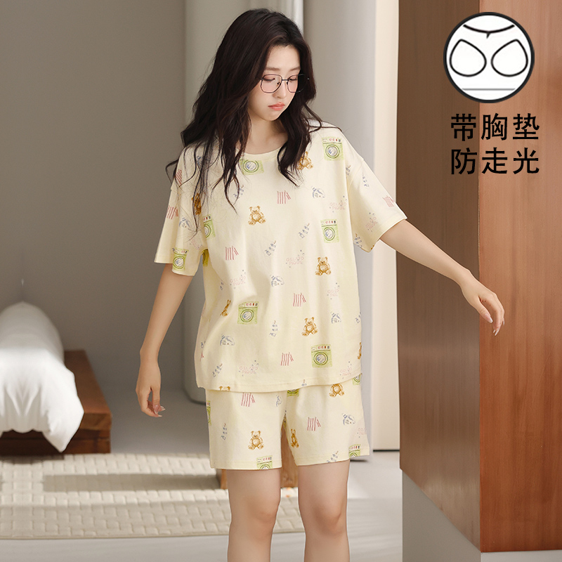 舒适家居服套装 夏季 可外穿可爱卡通大码 短裤 带胸垫女睡衣宽松短袖