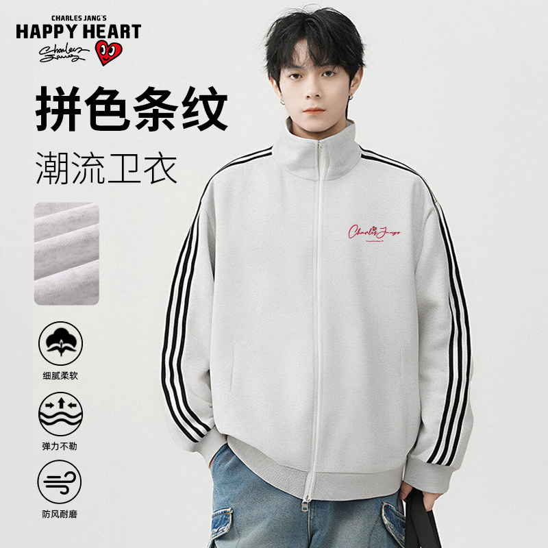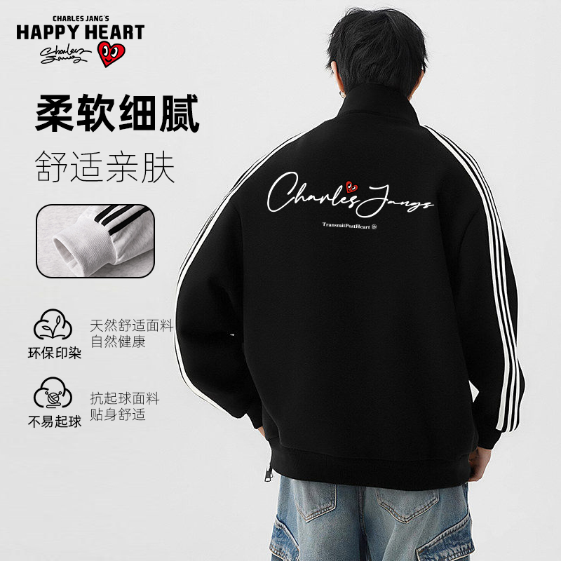 宽松 卫衣男手绘字母印花春秋情侣新款 查尔斯桃心 拉链条纹开衫
