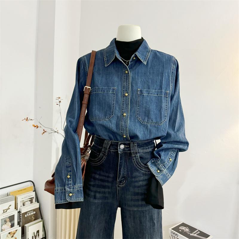 复古港风正肩软牛仔衬衫 女不卷边秋冬内搭时髦叠穿衬衣宽松上衣蓝