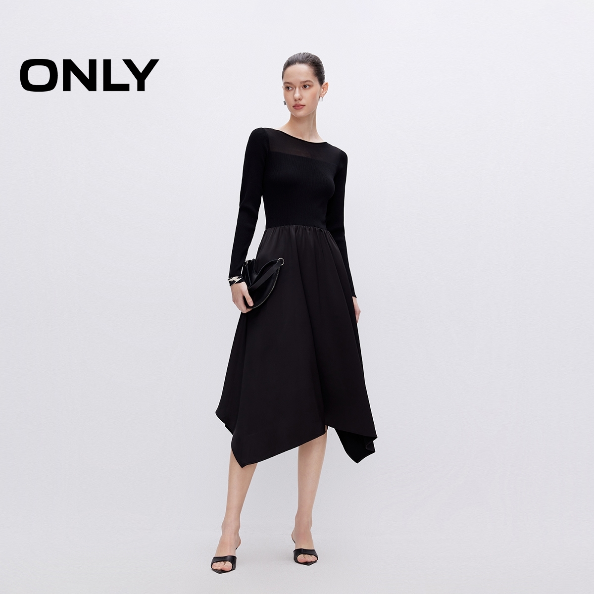 连衣裙女 ONLY2025夏季 A字收腰中长款 气质圆领长袖 125107013 新款