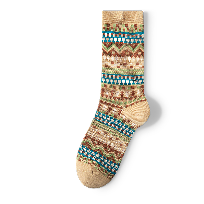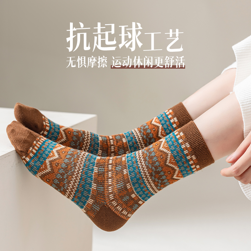 袜子公园女士袜子复古民族风秋冬季 加厚双针双路堆堆袜中筒棉袜