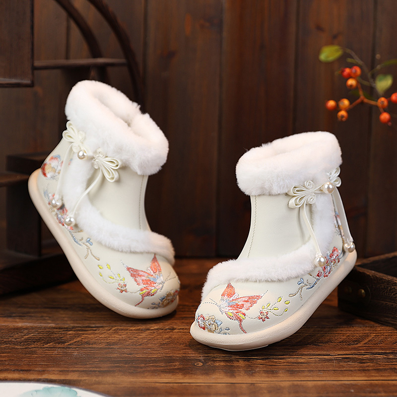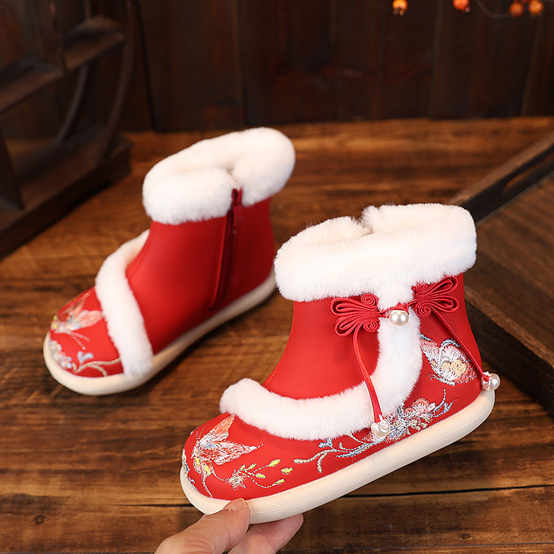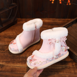 古风刺绣筒靴雪地靴2024秋冬新款 保暖短靴宝宝 女童加绒防水大棉鞋