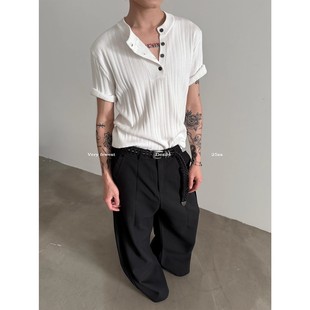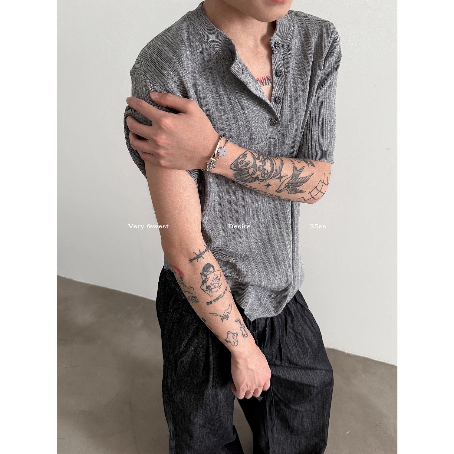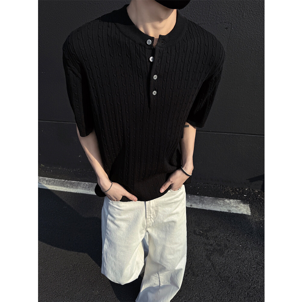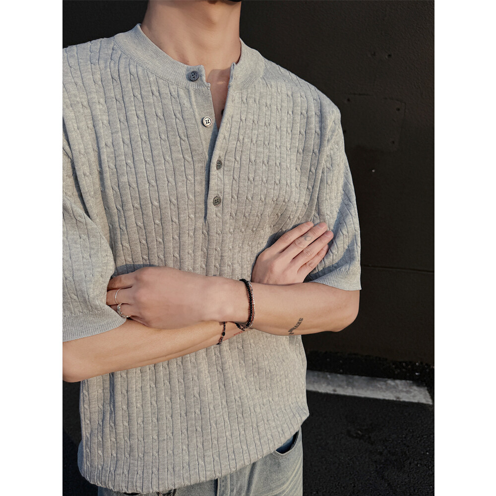 收口半袖 修身 高知通勤风针织短袖 老钱风麻花编织亨利领t恤男夏季