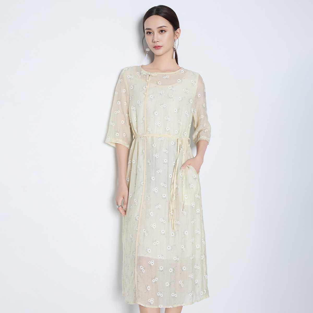 马天奴2025春夏新款 女 杏色莱赛尔混纺印花连衣裙子系带收腰新中式