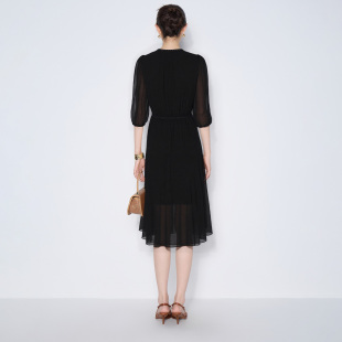 简约女 黑色雪纺钉珠连衣裙子圆领收腰气质时尚 马天奴2025夏季 新款