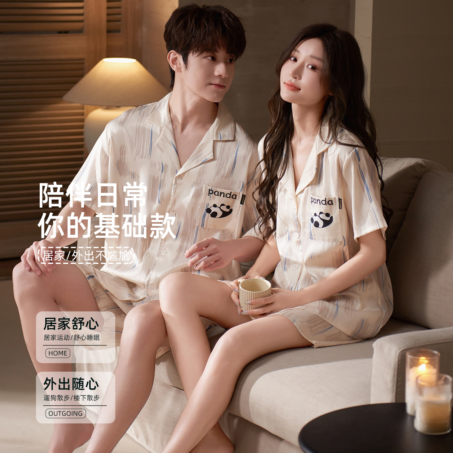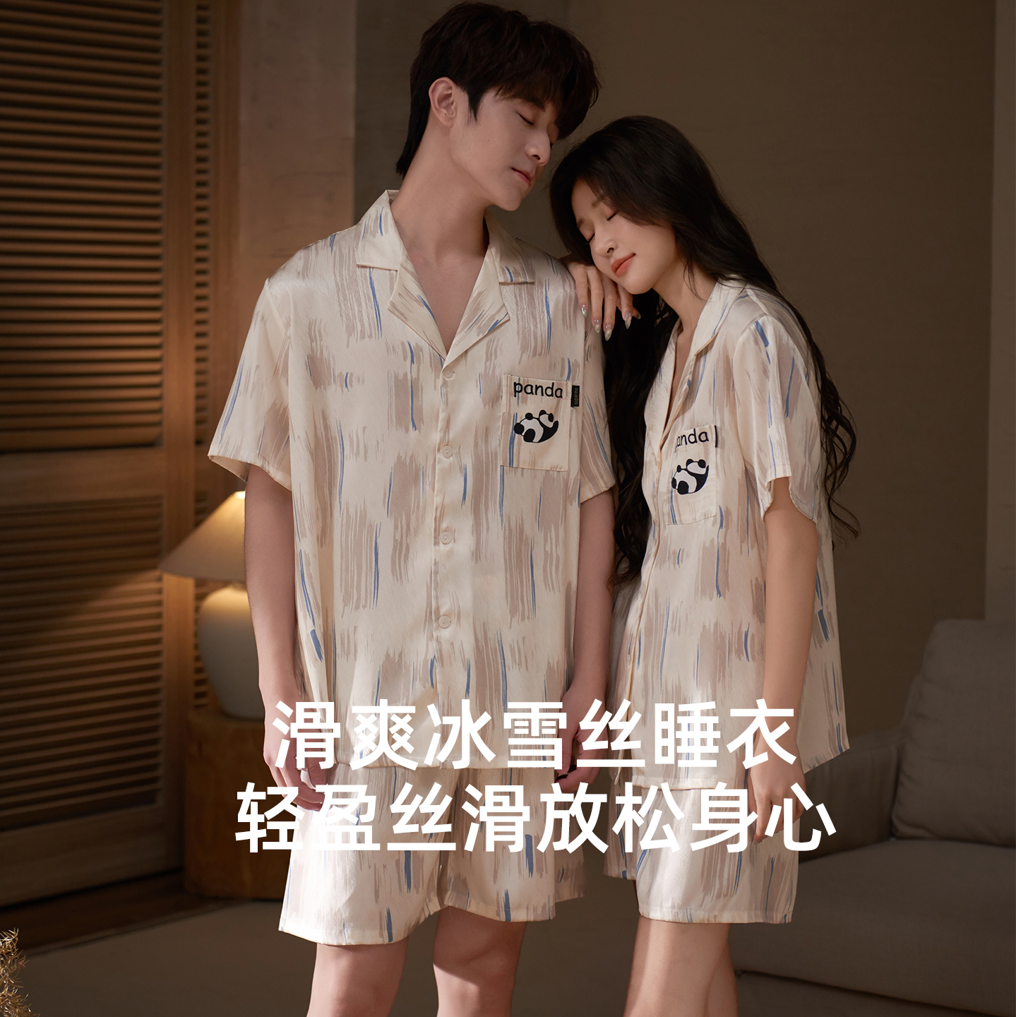 睡衣女夏季 男士 高级感冰丝短袖 套装 熊猫情侣家居服 短裤 乐姿梦新款