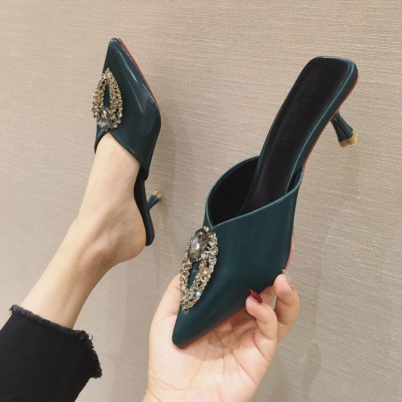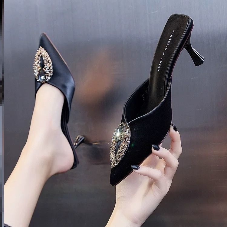 仙女风潮2025春夏新款 水钻方扣尖头高跟鞋 女细跟网红包头半拖凉鞋