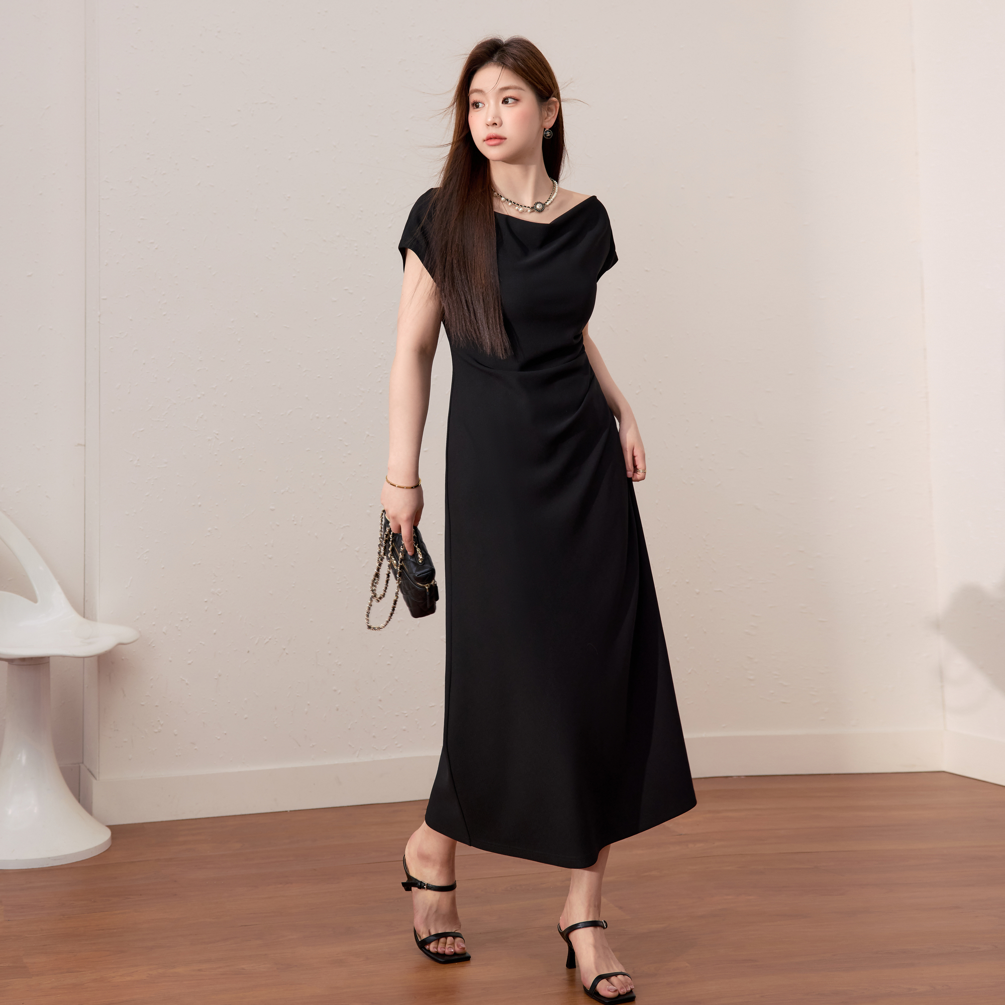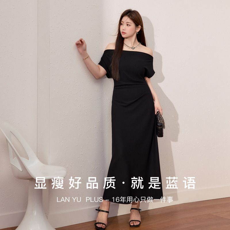 新款 重要场合气质黑色连衣裙夏季 收腰巨显瘦a字长裙 女装 蓝语大码
