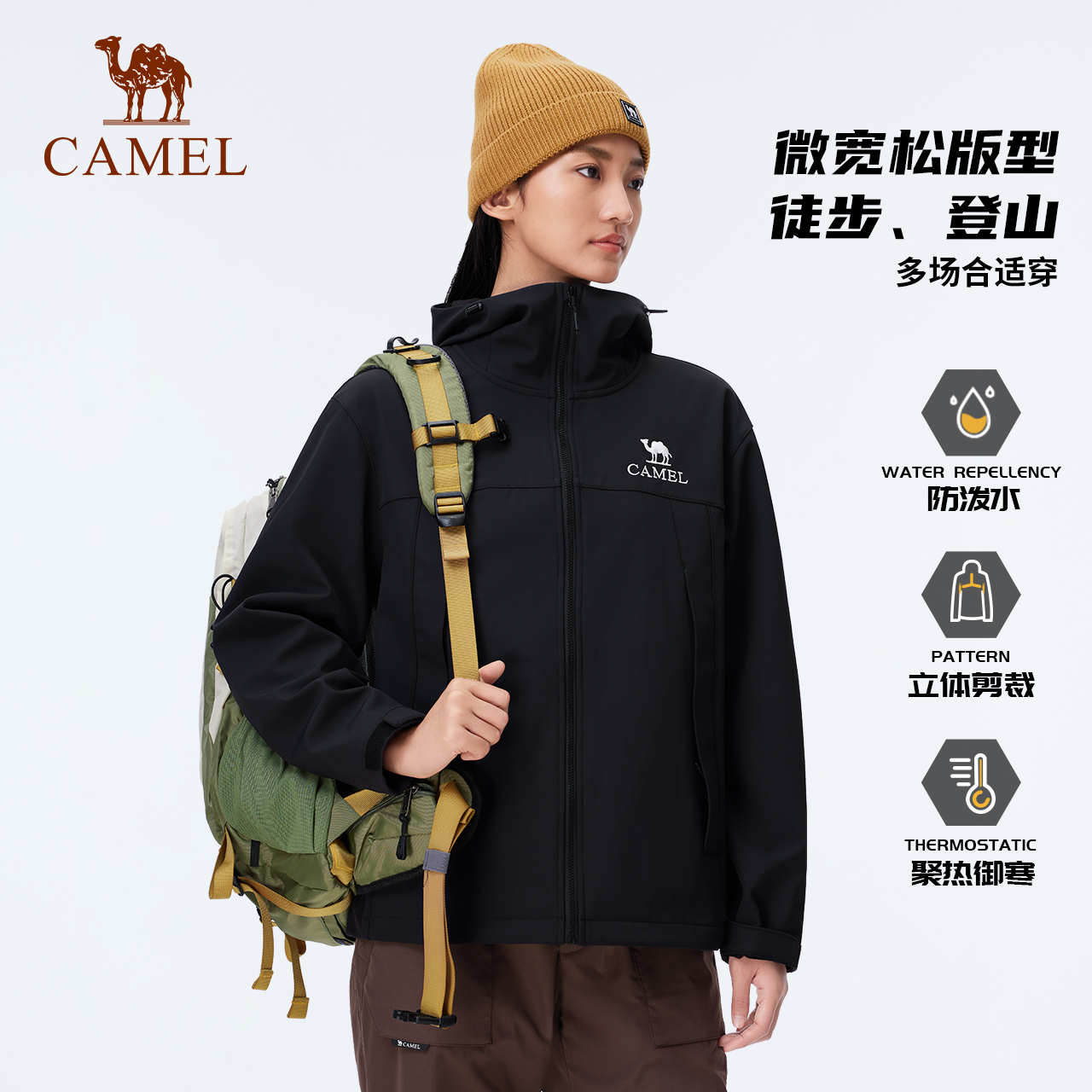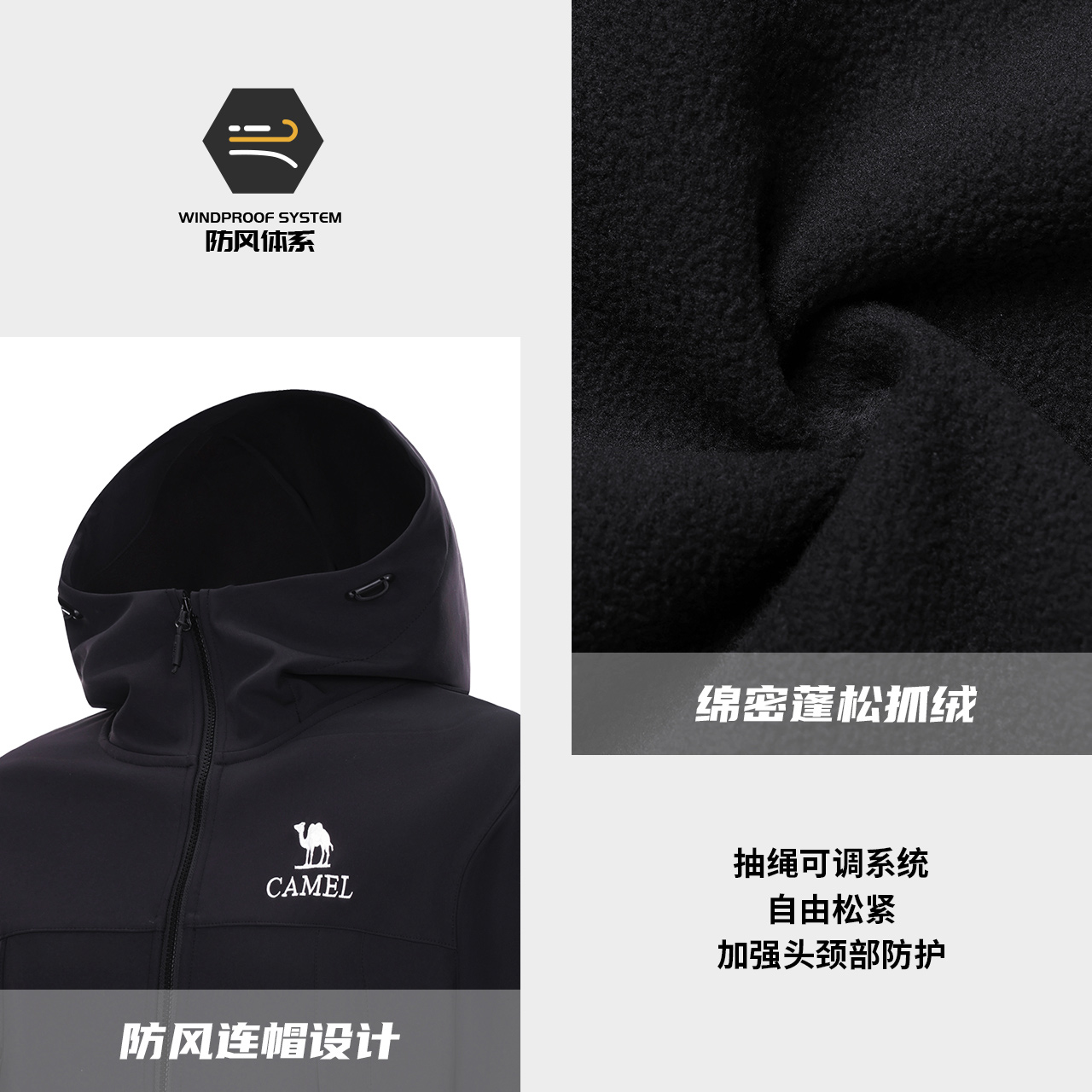 骆驼户外软壳衣外套男秋冬加绒加厚防风防水运动夹克连帽登山服女
