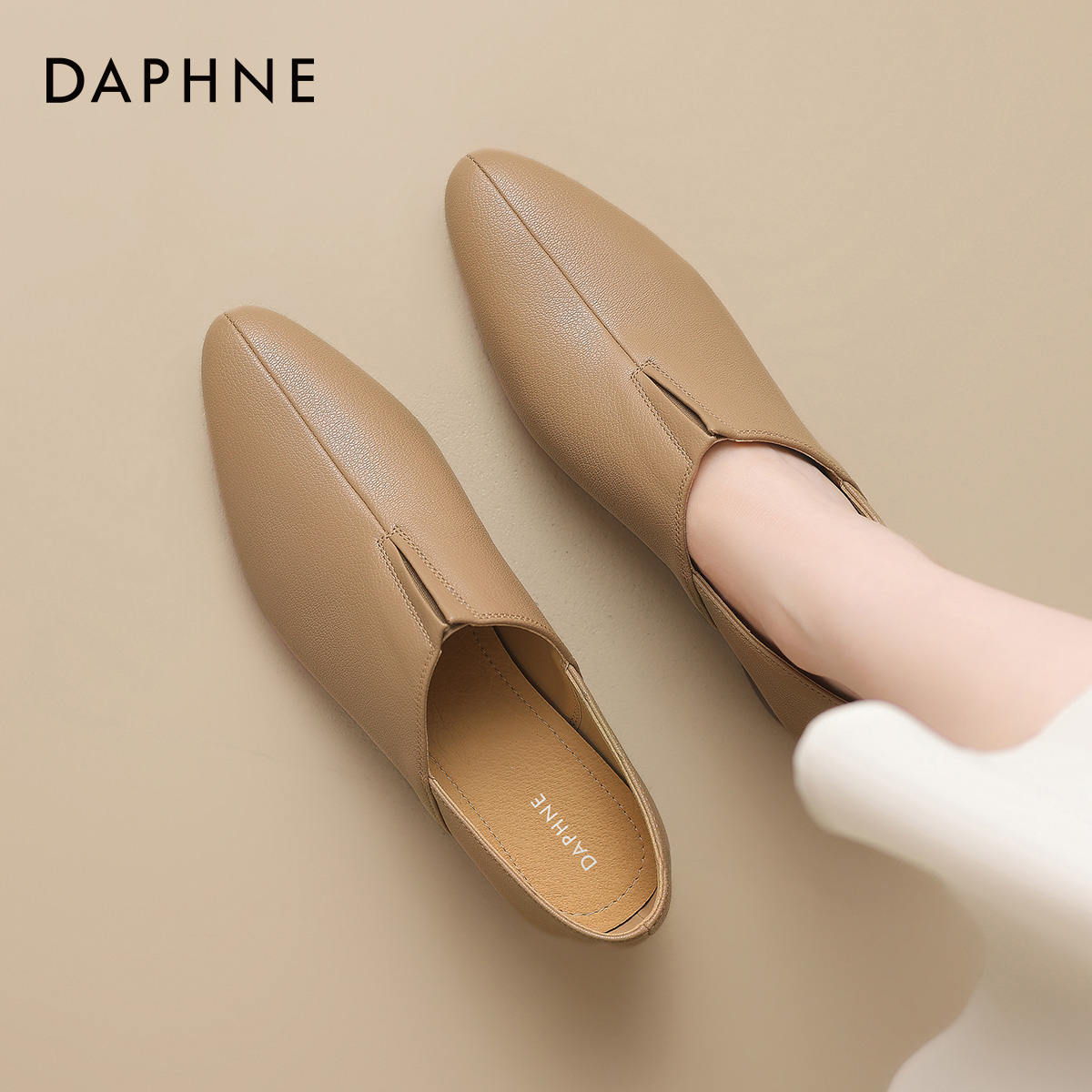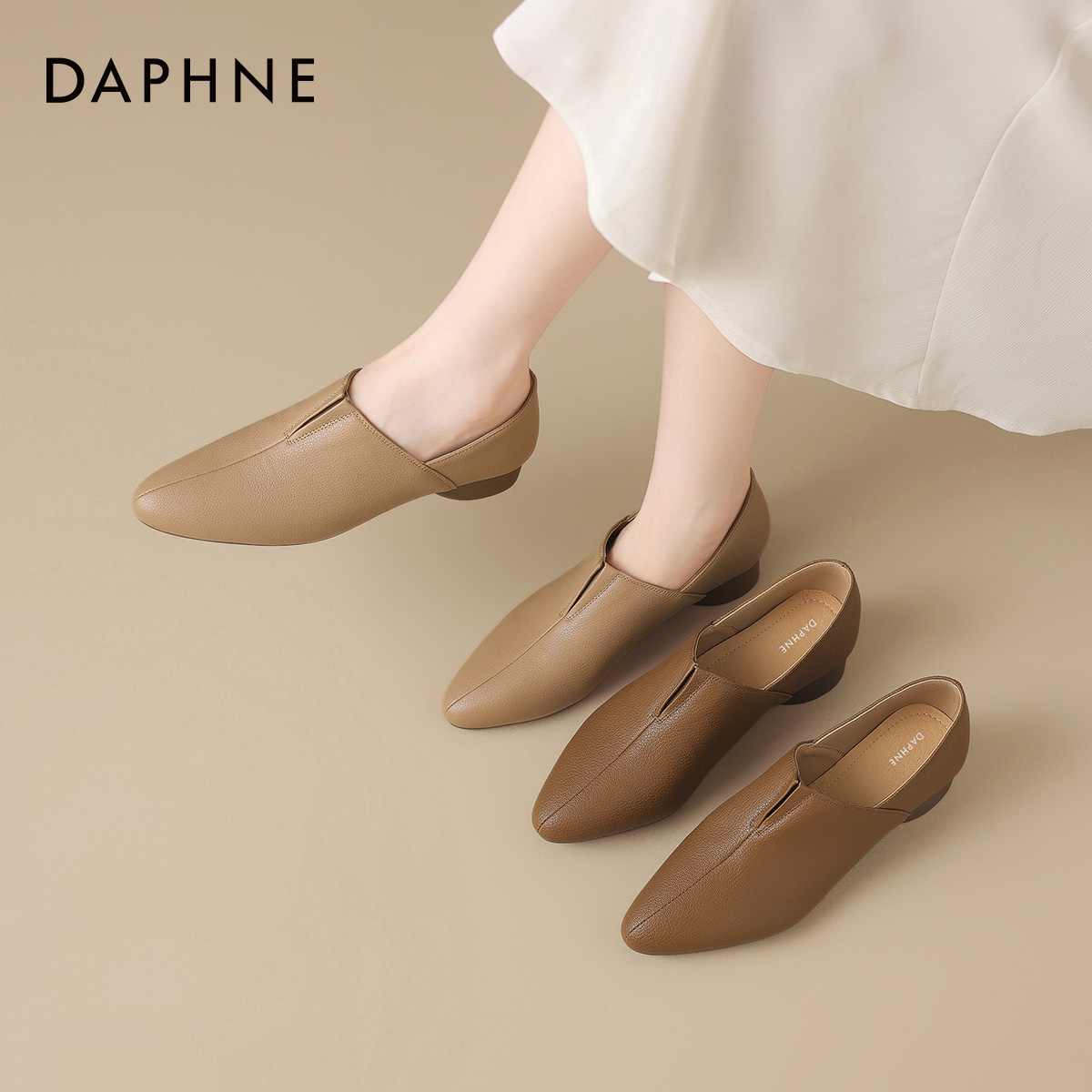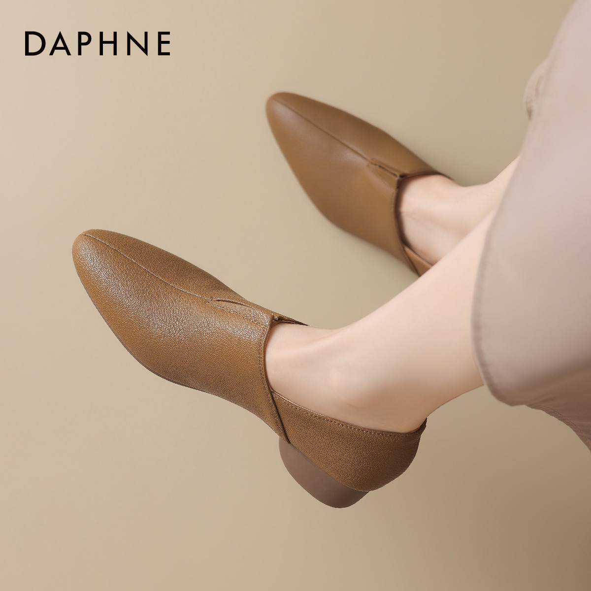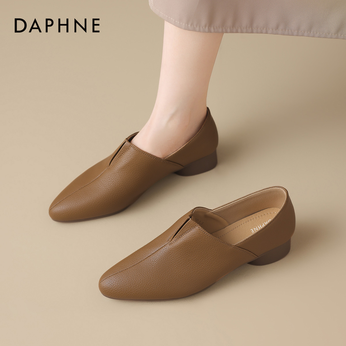 春秋女鞋 达芙妮深口羊皮单鞋 棕色小皮鞋 尖头低跟妈妈鞋 女2025新款