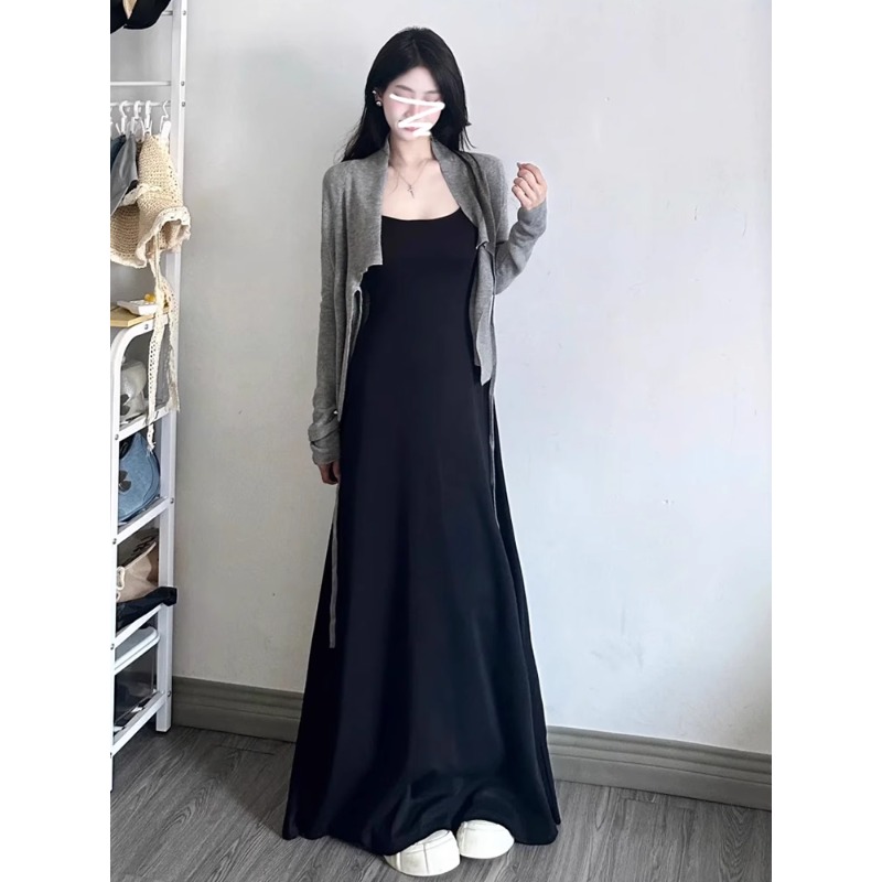 赫本风黑色吊带连衣裙子女春秋新款 长裙夏 防晒穿搭气质高级感套装