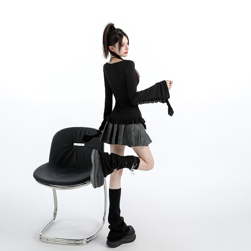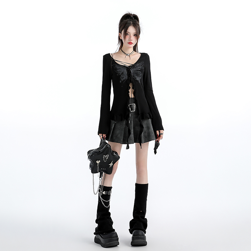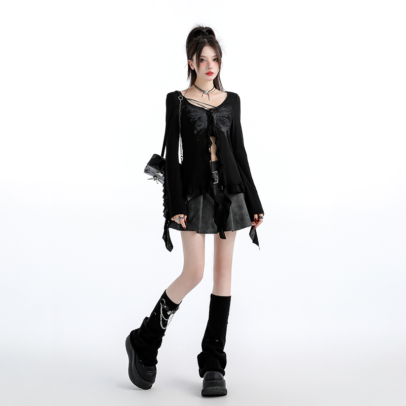 原创甜辣风黑色V领蝴蝶印花长袖 外套毛衣上衣外搭女 绑带针织开衫