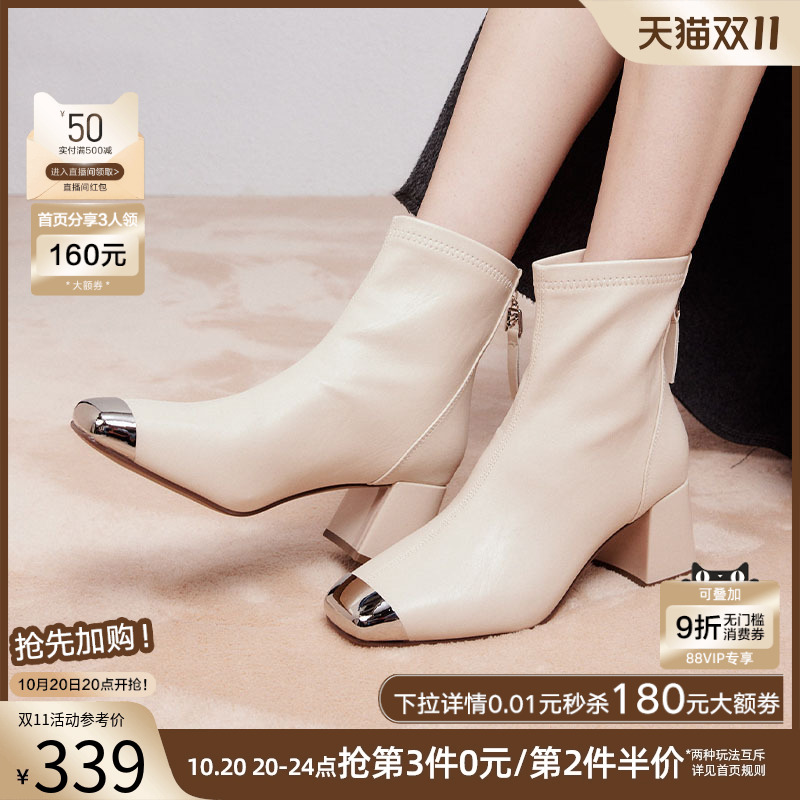 百思图冬季 气质通勤拼接弹力瘦瘦靴方头女短靴M5163DD4 商场新款