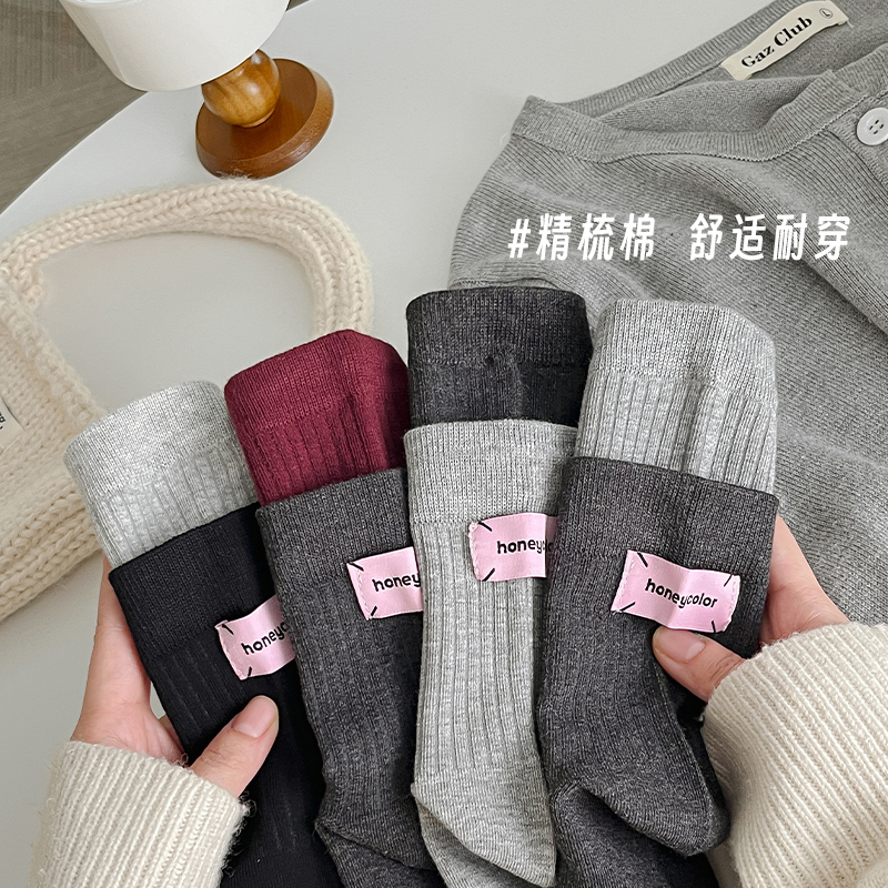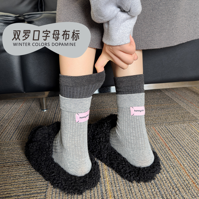 双层拼接撞色后跟布标中筒袜子女潮流时尚 运动风灰色堆堆袜长筒袜