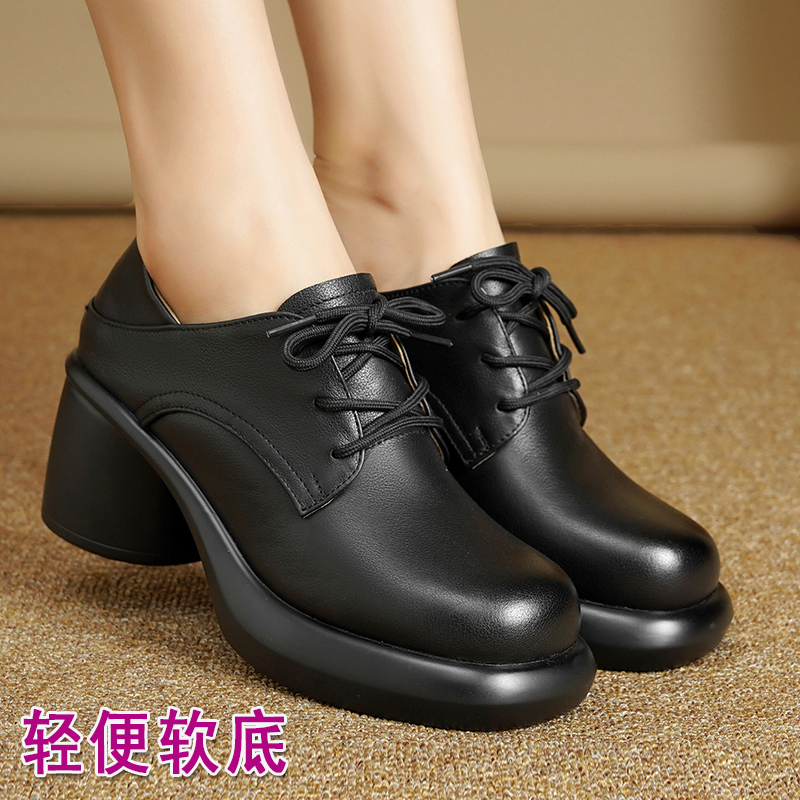子女款 黑色厚底高跟单鞋 真皮软底妈妈鞋 春秋粗跟系带女士皮鞋 女鞋