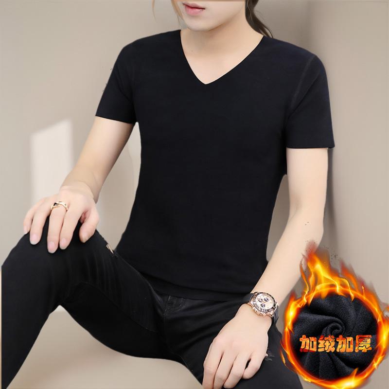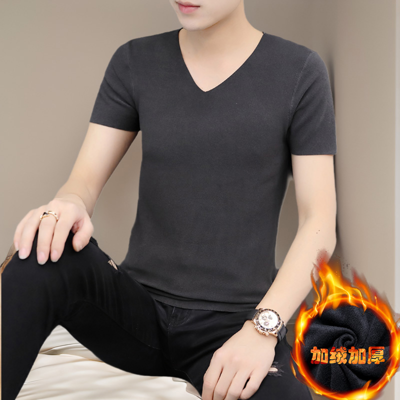 打底衫 t恤男v领加厚磨毛双面绒保暖内衣内搭上衣半袖 加绒短袖 冬季