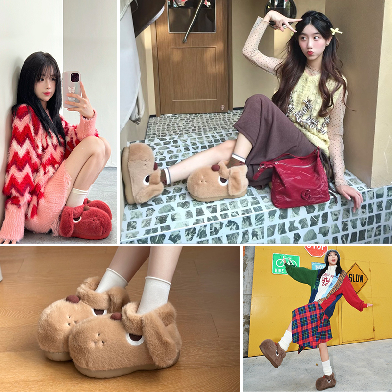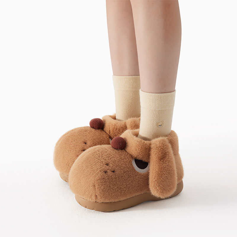chikoku卡通小狗毛绒棉拖鞋 防滑棉拖男 跟女秋冬室内加绒包月子鞋