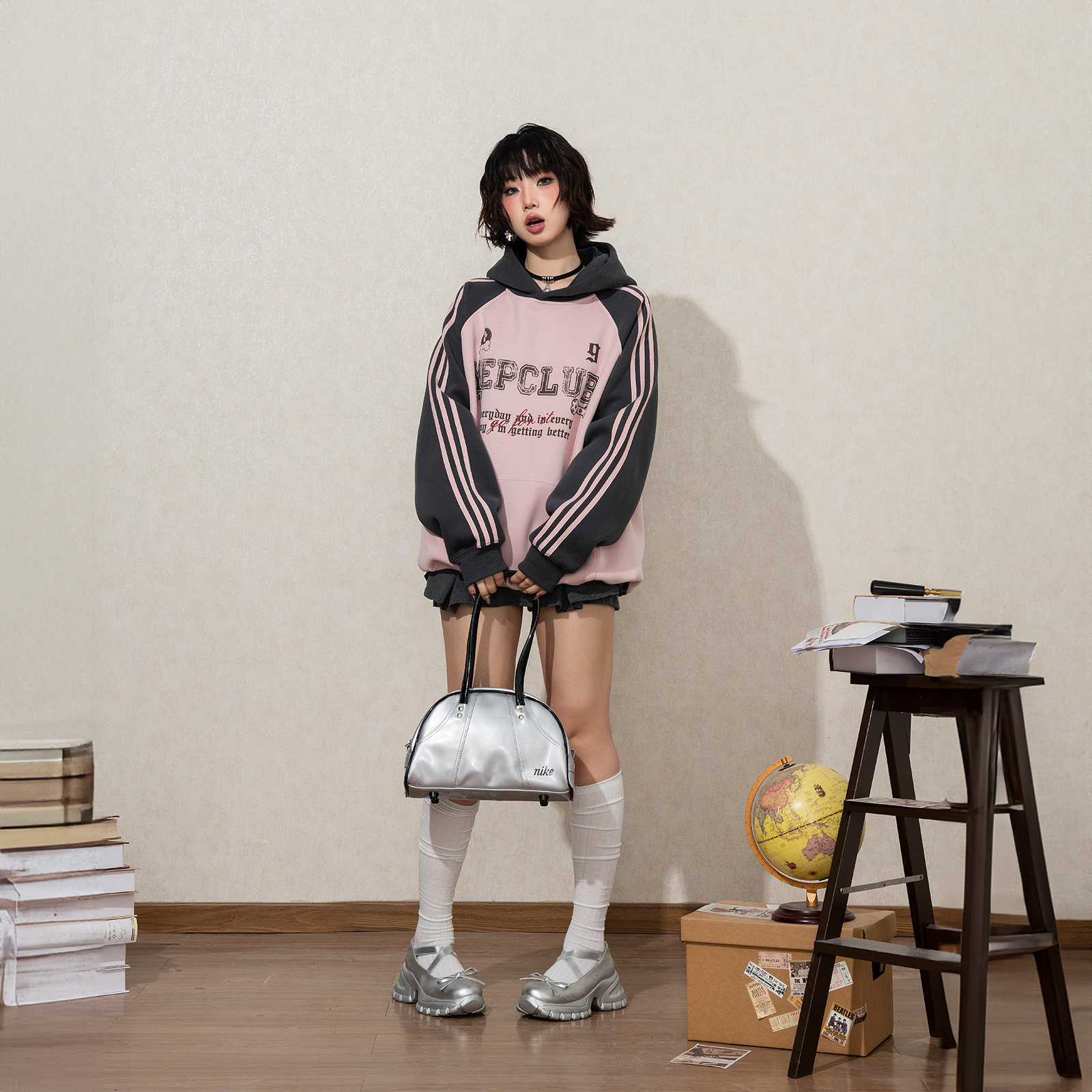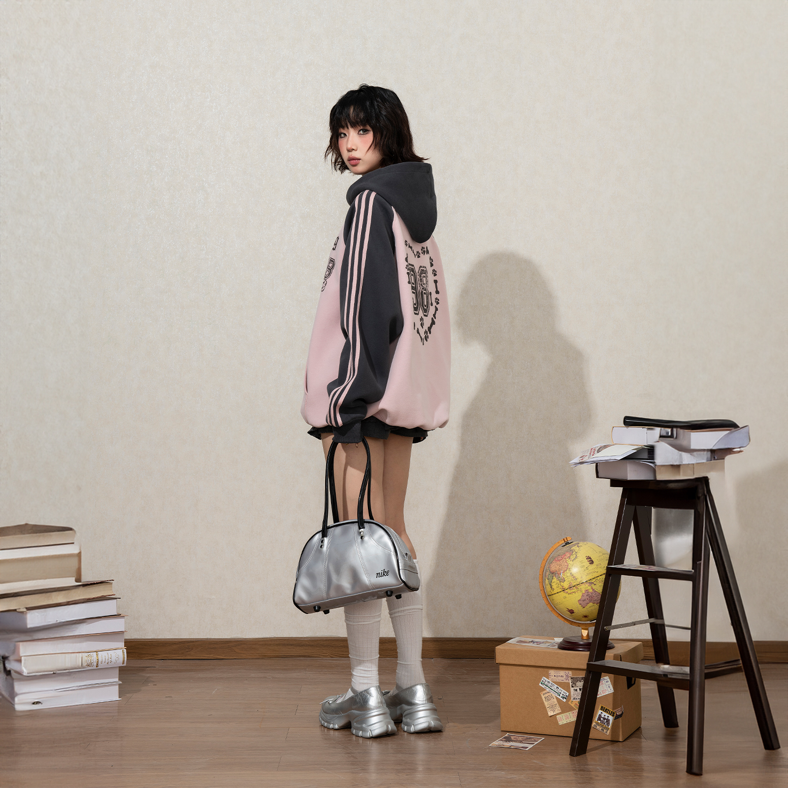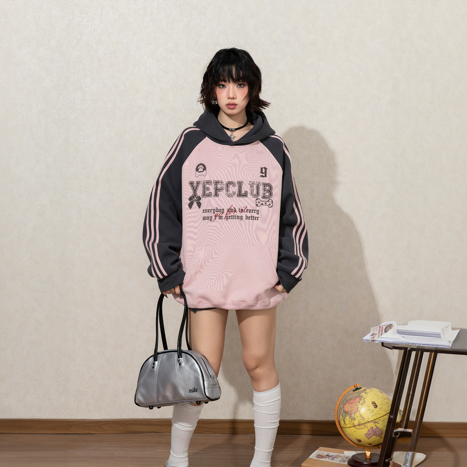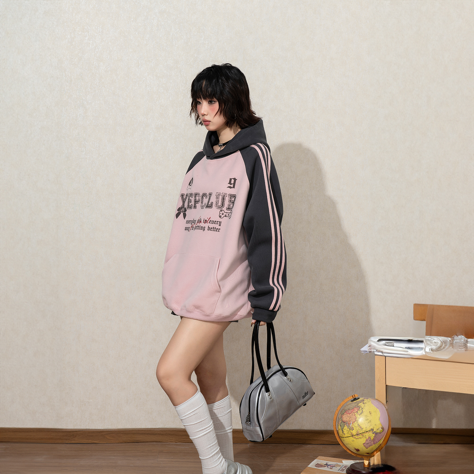 宽松初秋外套 条纹帽衫 YEP复古拼接印花连帽卫衣女春秋新款 插肩袖