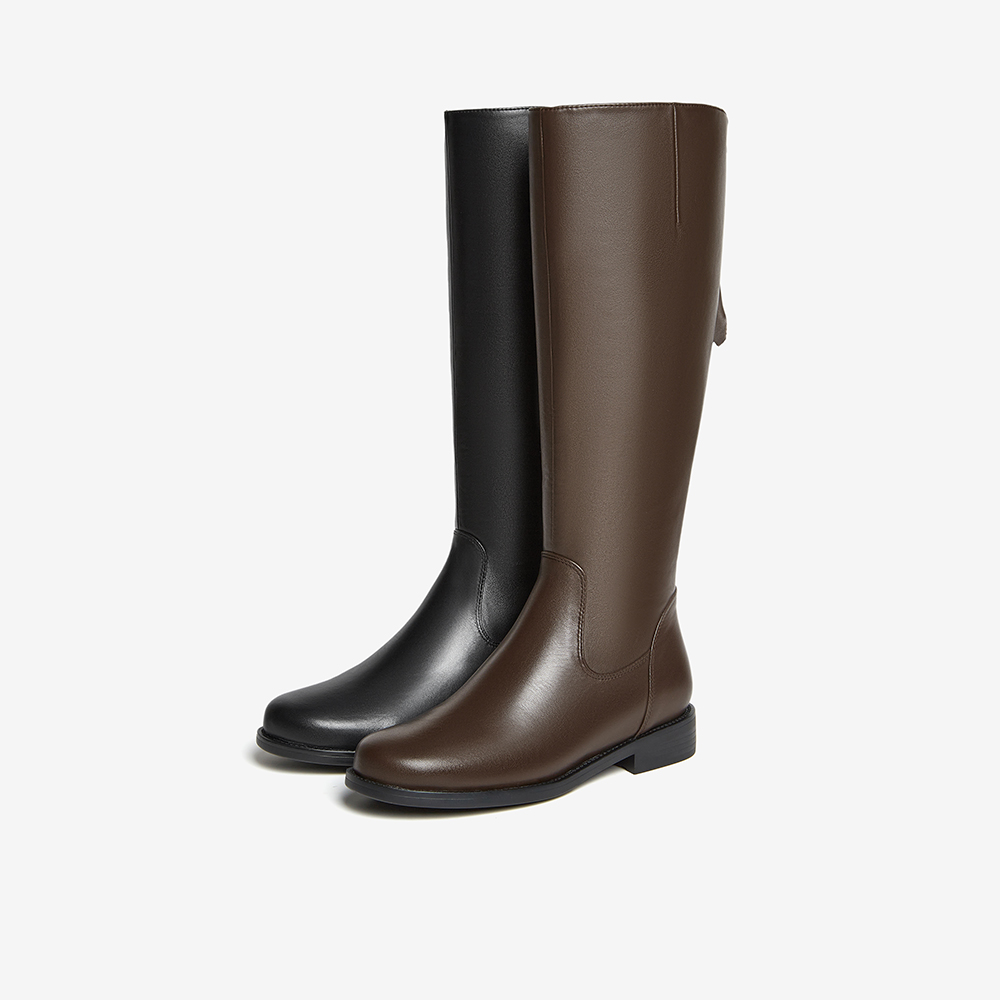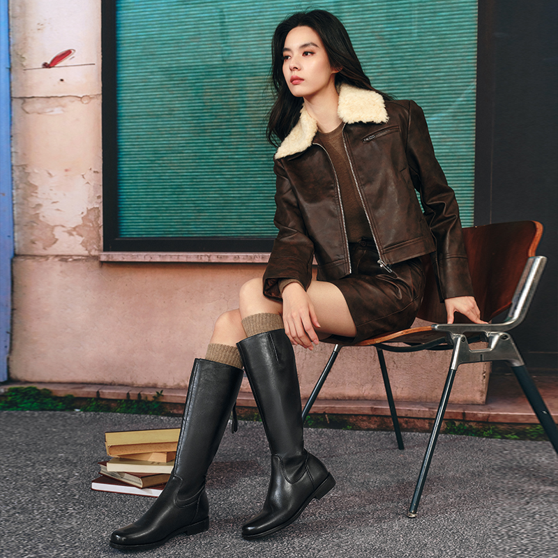 马思纯同款 金属搭扣长筒堆堆靴圆头中筒骑士靴子女 unfolio2025款