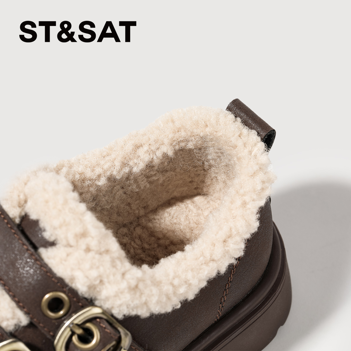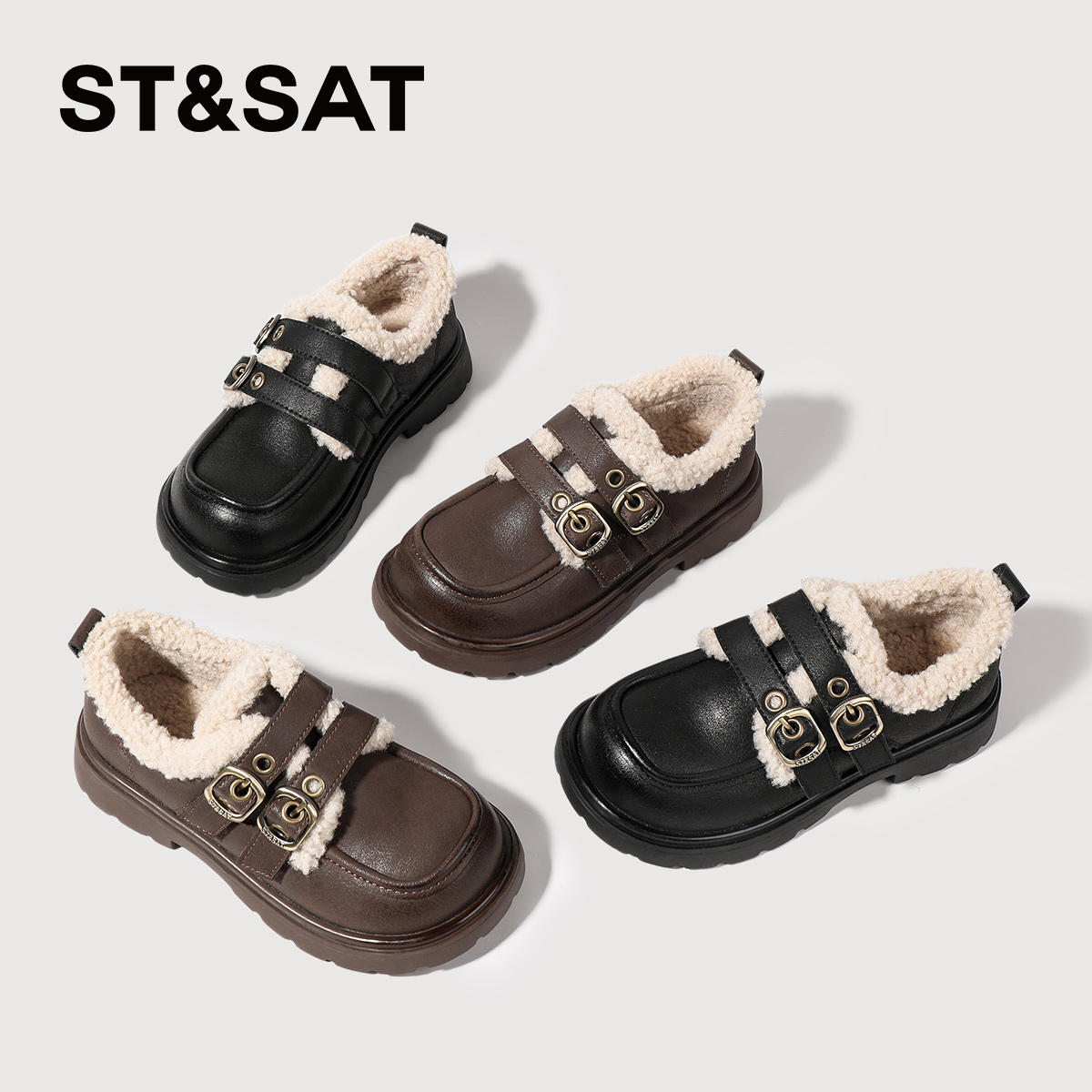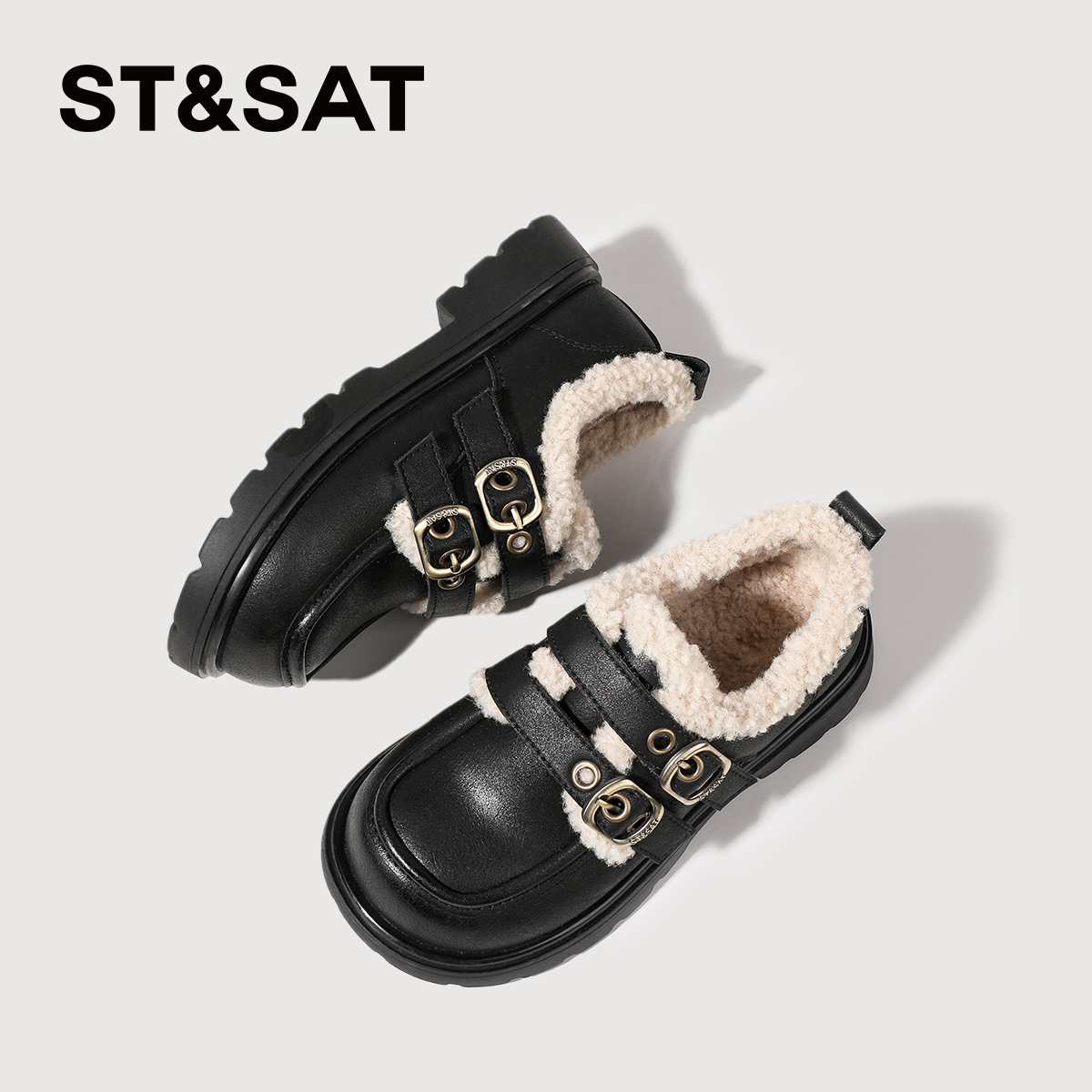 黑色单鞋 张凌赫推荐 女款 复古厚底加绒冬季 子预 百丽黑巧乐福小皮鞋