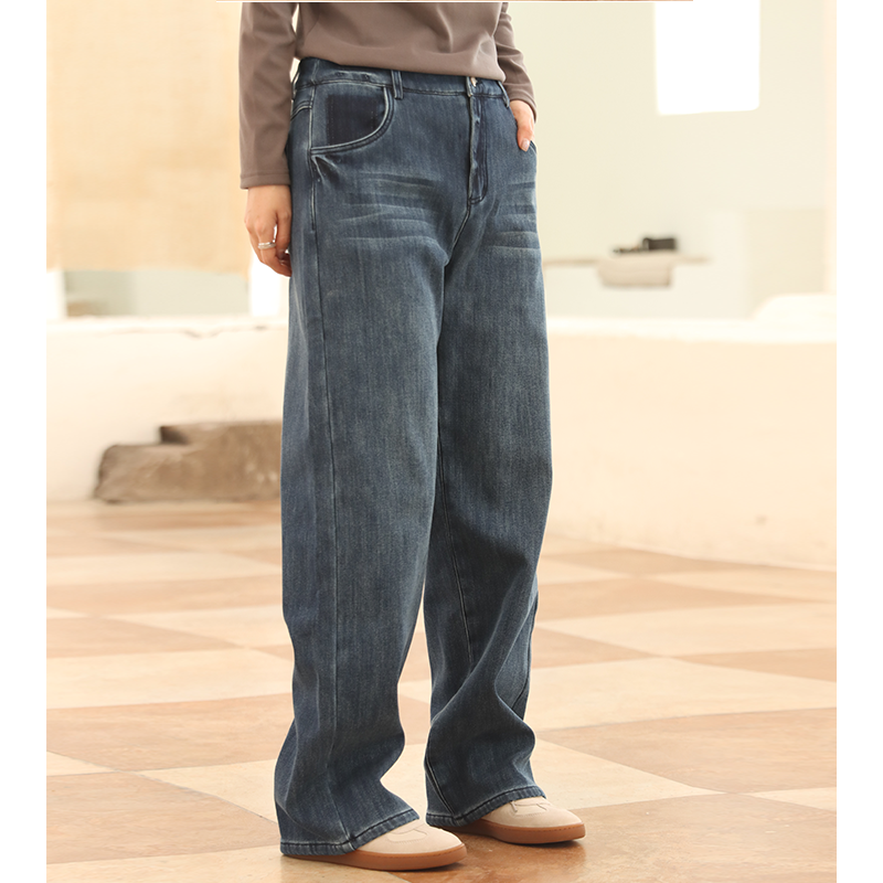 高腰加绒加厚直筒慵懒宽松阔腿牛仔裤 子休闲经典 女 裤 无色无味新款