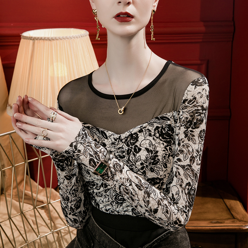 女修身 网纱拼接透视复古印花打底衫 淑女洋气蕾丝上衣 新款 2025秋季