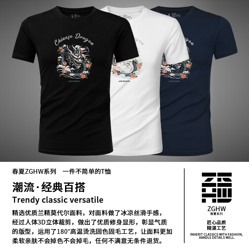 体恤 圆领上衣潮流冰丝凉感印花半袖 ZGHW莫代尔黑色t恤男短袖 夏季