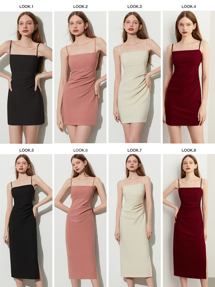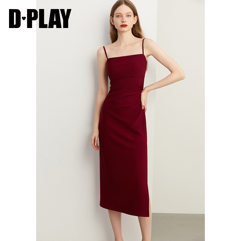 DPLAY夏气质法式 果酱红捏褶开衩吊带裙新娘回门服宴会长裙裙子女