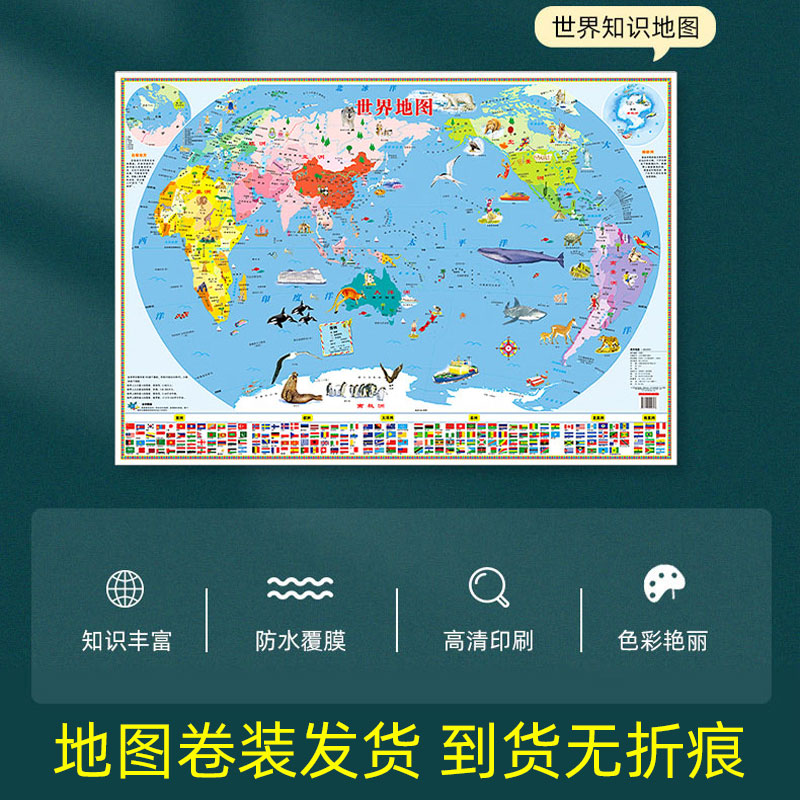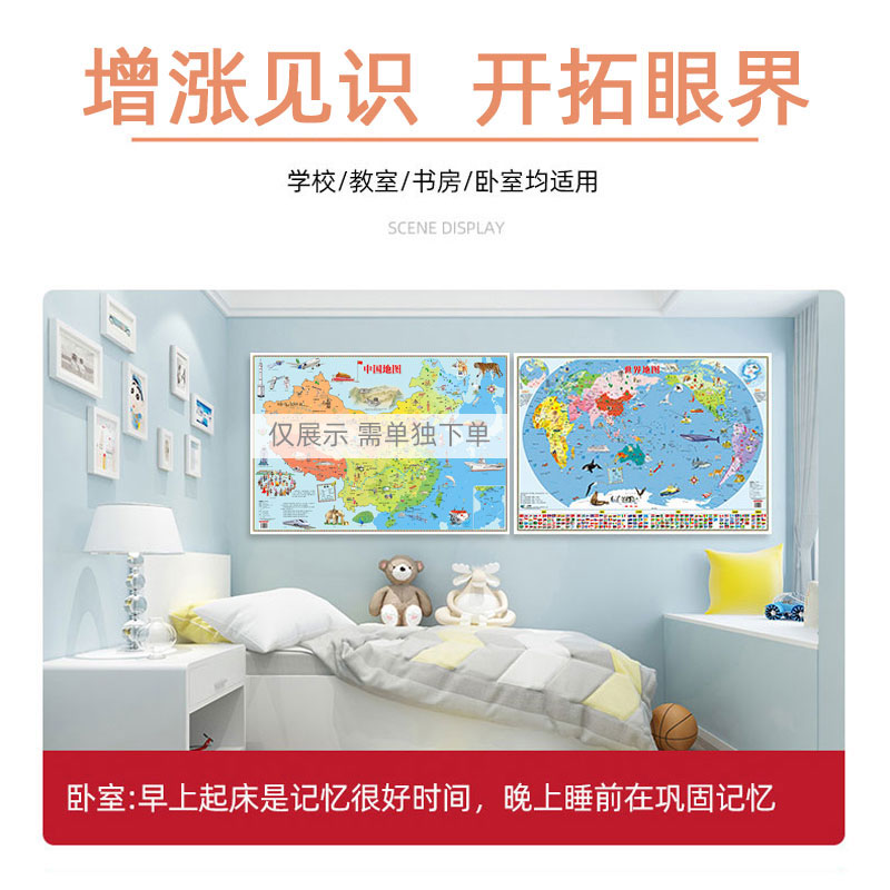 儿童房墙面装 世界地图儿童版 少儿地理百科知识早教启蒙地图 超大尺寸100x70厘米 饰画墙贴 2025年新版