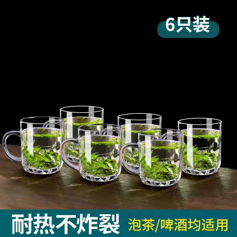 玻璃杯套装 家用客厅耐高温绿茶杯大容量带把水杯6只待客喝水杯子