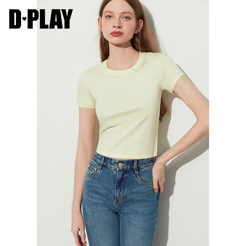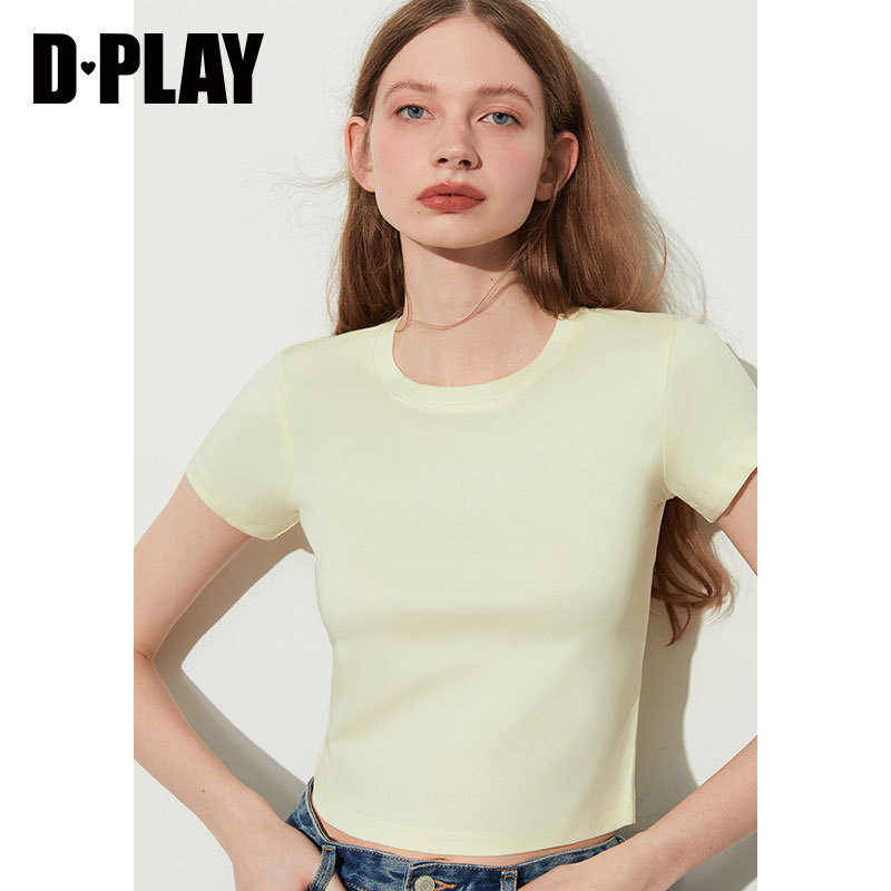 DPLAY气质简约色彩氛围奶油黄100全棉正肩圆领短袖 T恤