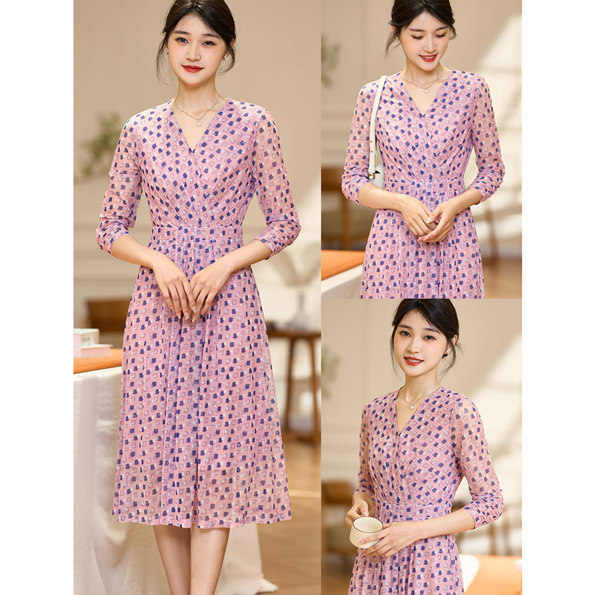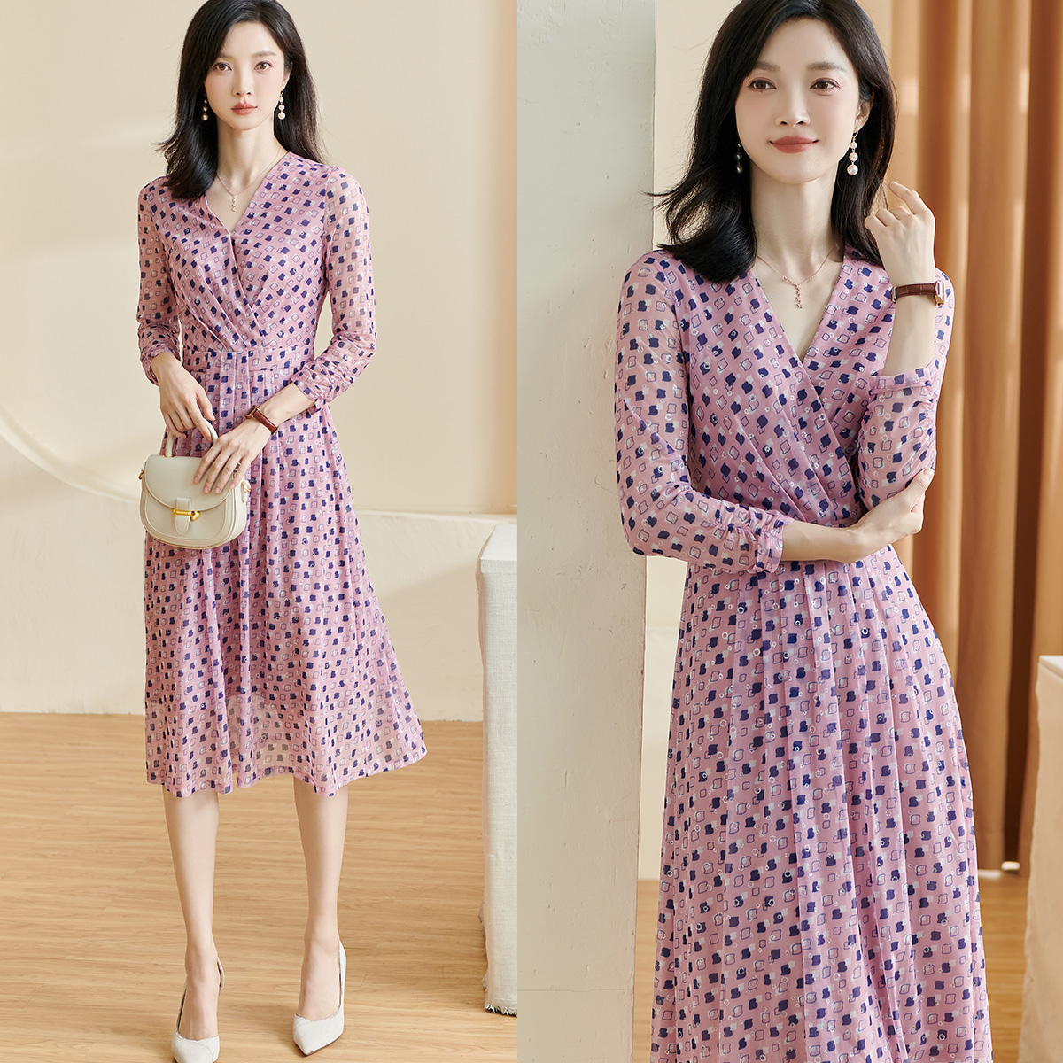 碎花连衣裙v领遮肚显瘦裙子中长裙女 通勤法式 米思阳2025秋季 新款