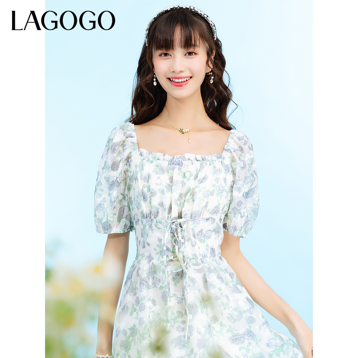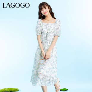 气质修身 Lagogo拉谷谷夏新款 连衣裙女短袖 一字领甜美茶歇法式 法式