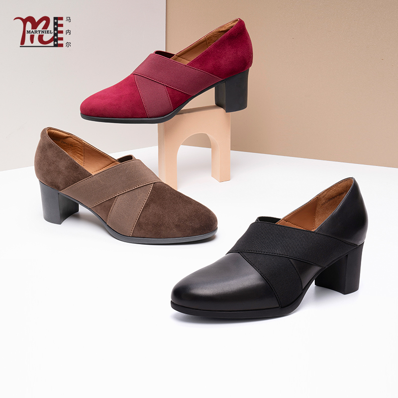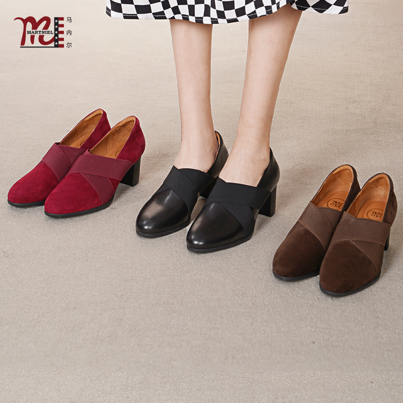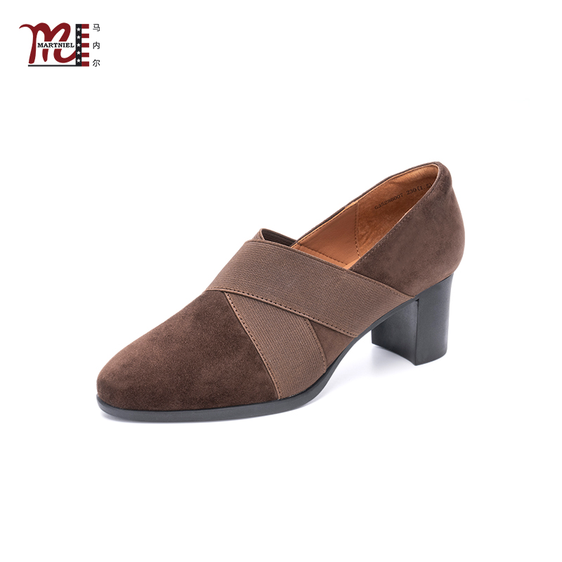 女G35286 粗跟深口单鞋 马内尔高跟鞋 秋冬复古一脚蹬松紧口棕色女鞋
