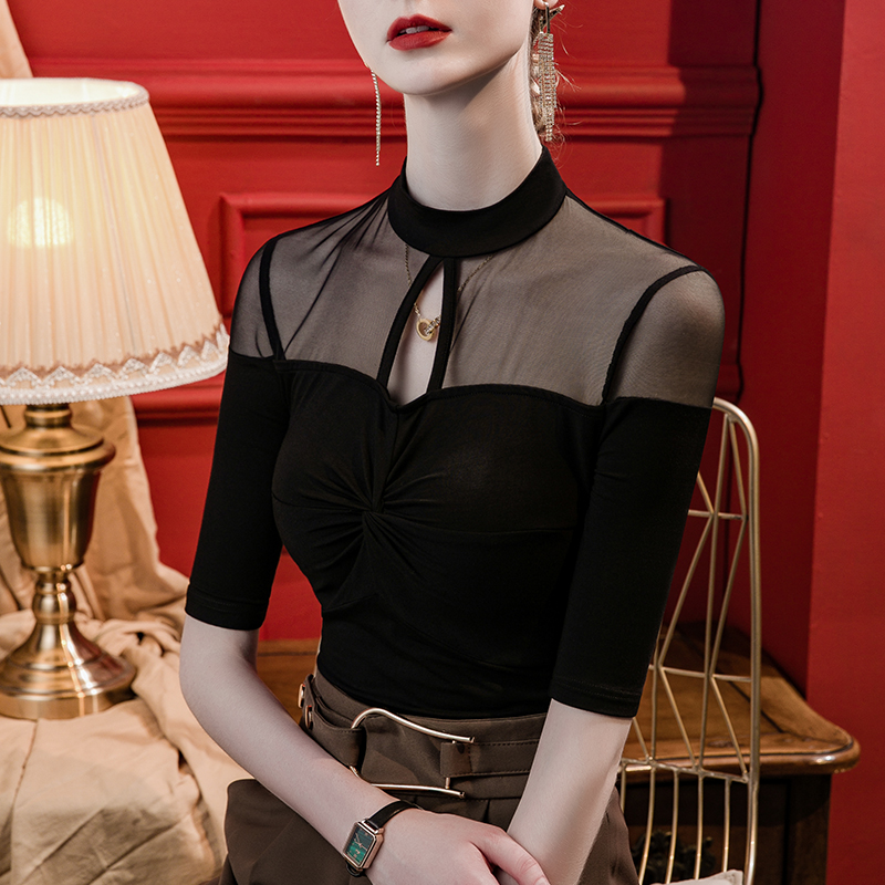 女五分袖 中袖 2025秋季 网纱拼接女装 上衣 新款 立领莫代尔镂空打底衫