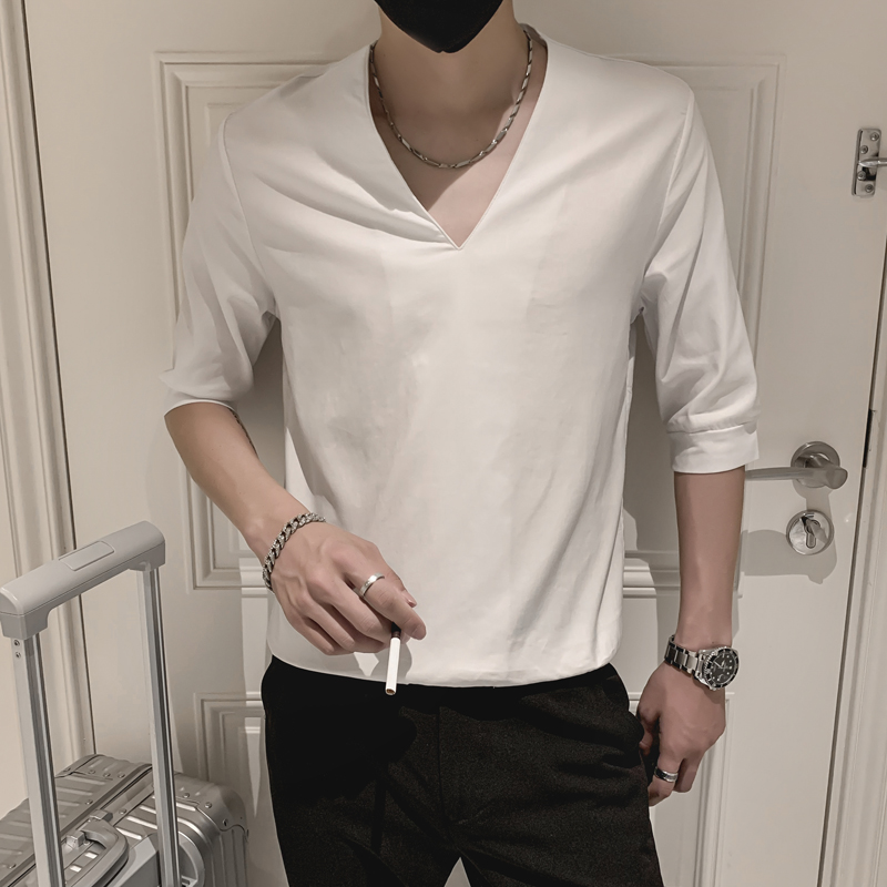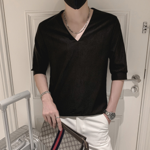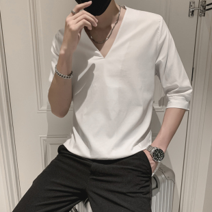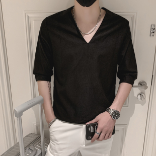 潮牌ins休闲半袖 夏天短袖 个性 体恤新款 上衣男 T恤男潮流V领五分袖